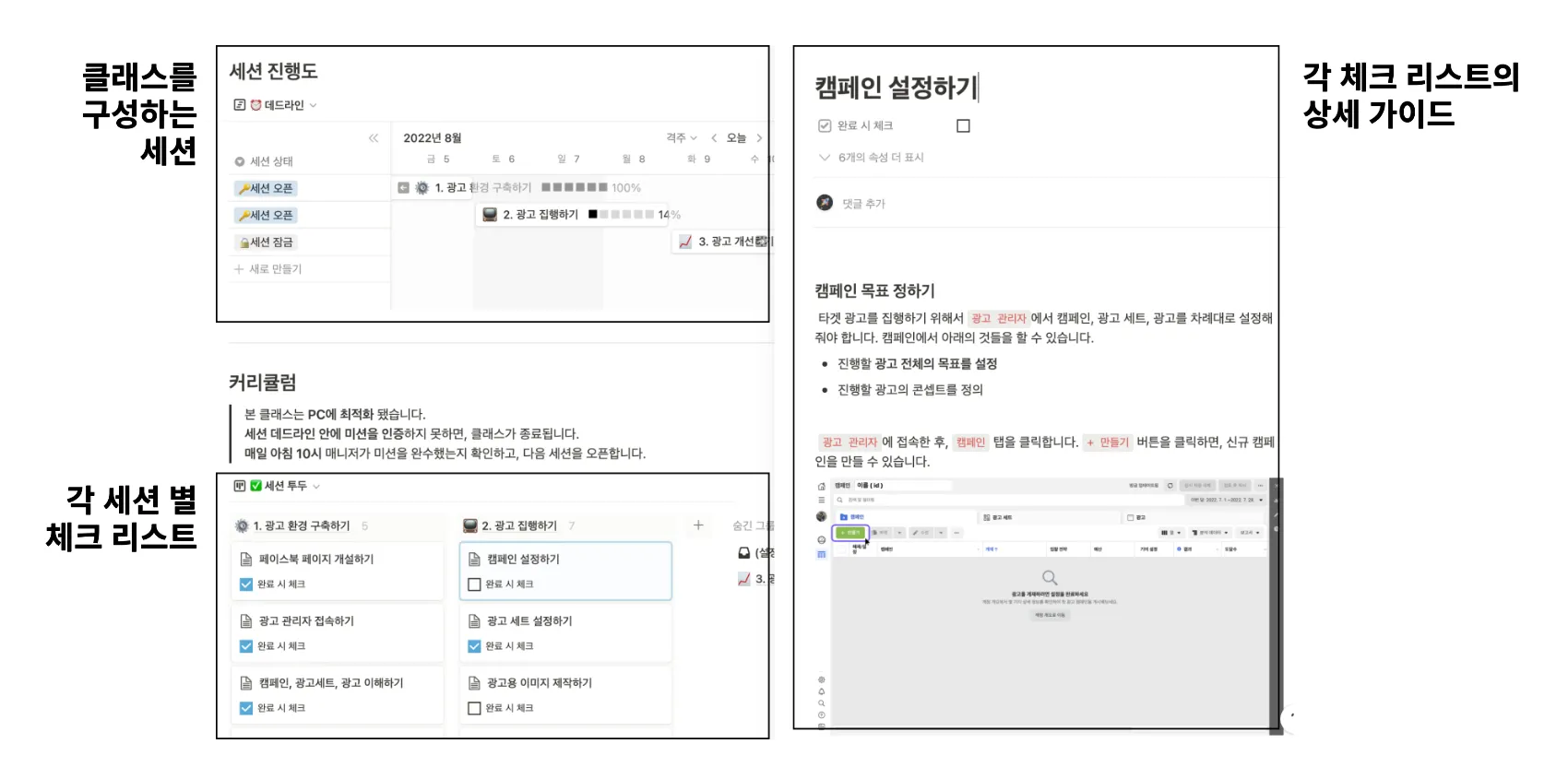"클래스"는 여러 "세션(목차)"으로 구성되고, 각 세션마다 따라 해야 하는 "체크리스트"가 있다.