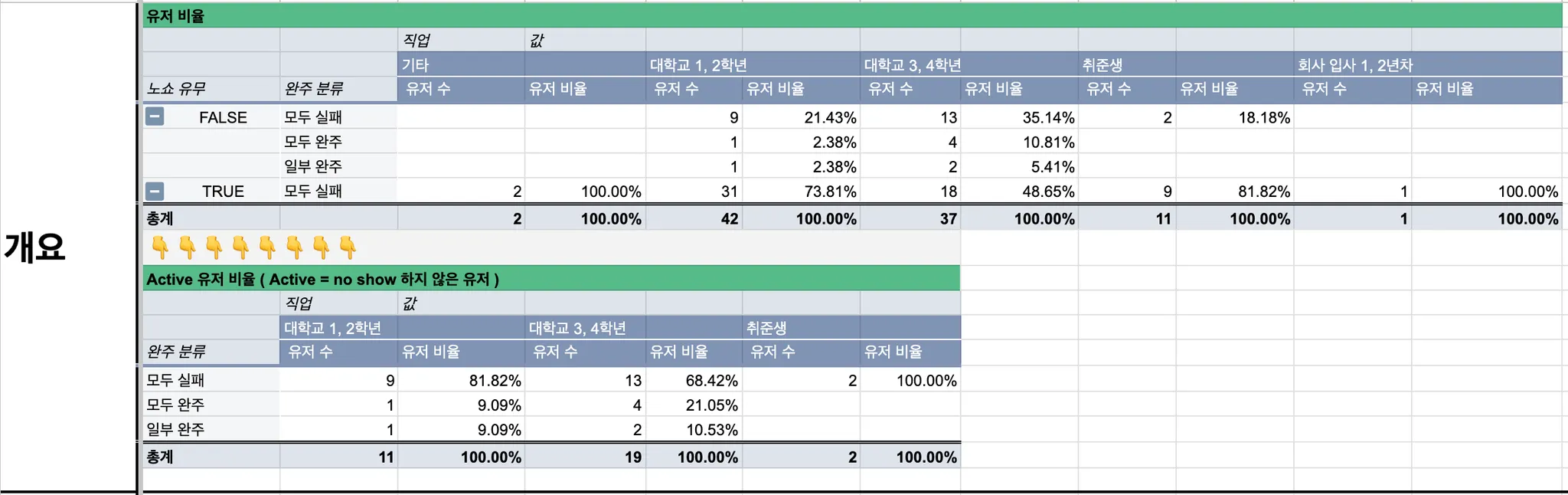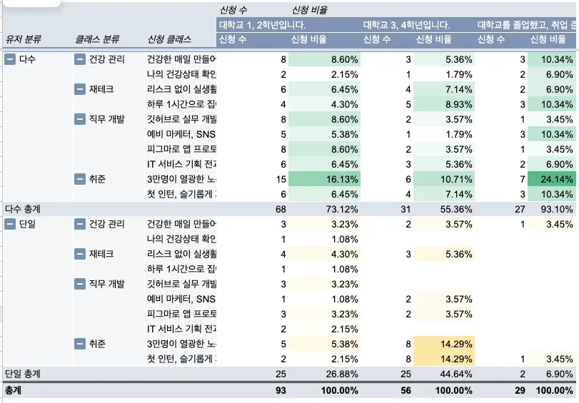 완주율 수치를 보면, 졸업을 앞둔 대학생(3~4학년)이 투두몰 서비스에 가장 핏합니다.