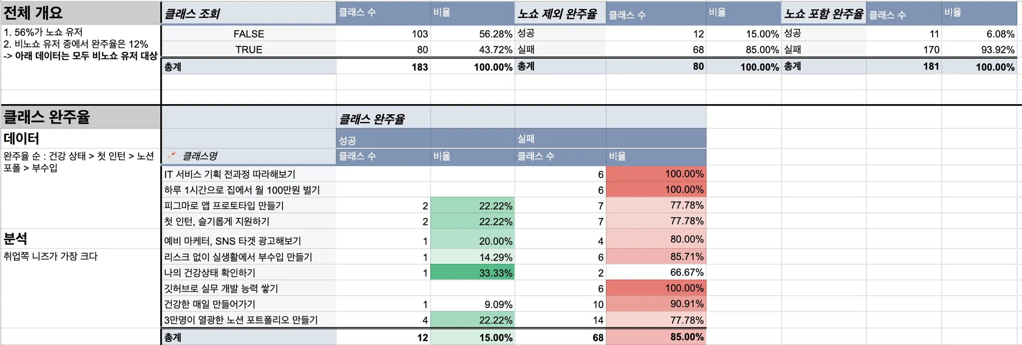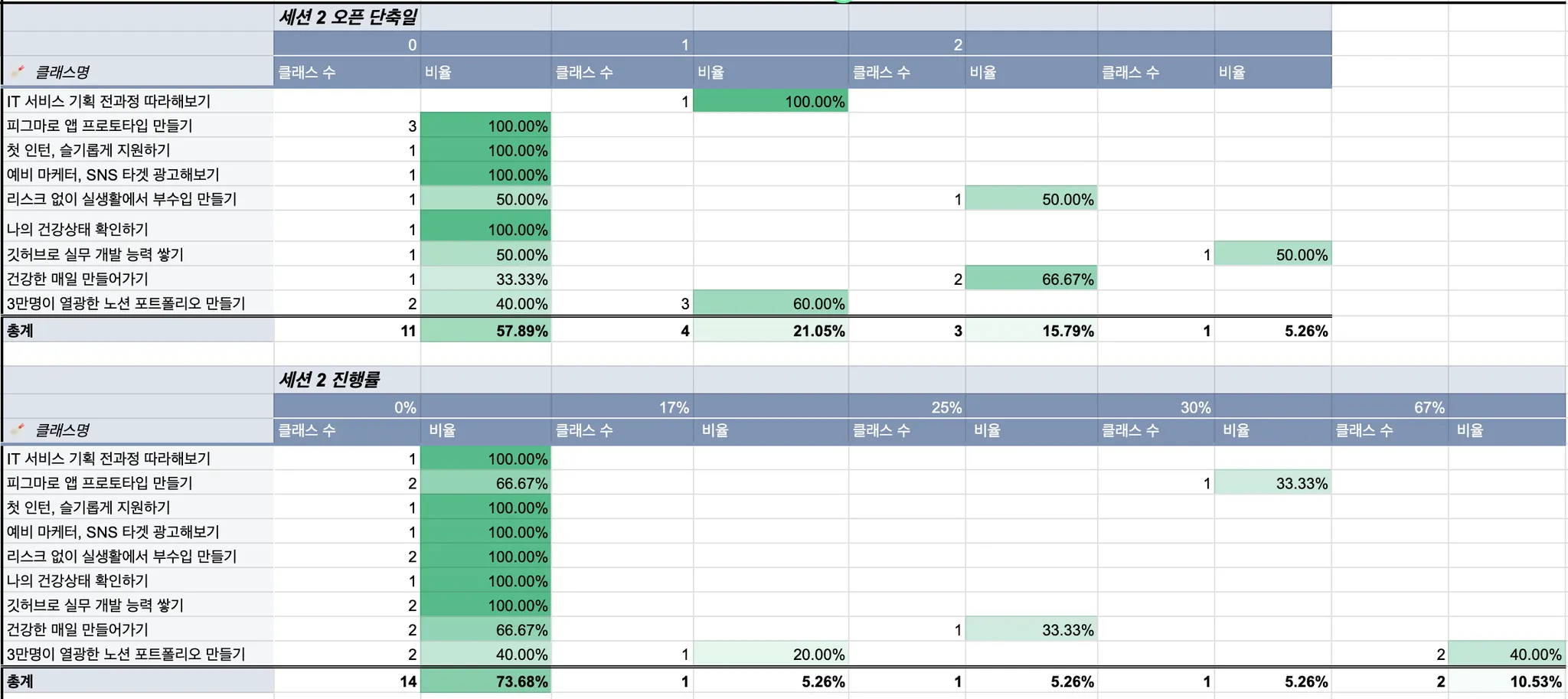 클래스의 평균 완주율은 15%로, 목표인 20%보다 낮은 수치를 보였습니다.