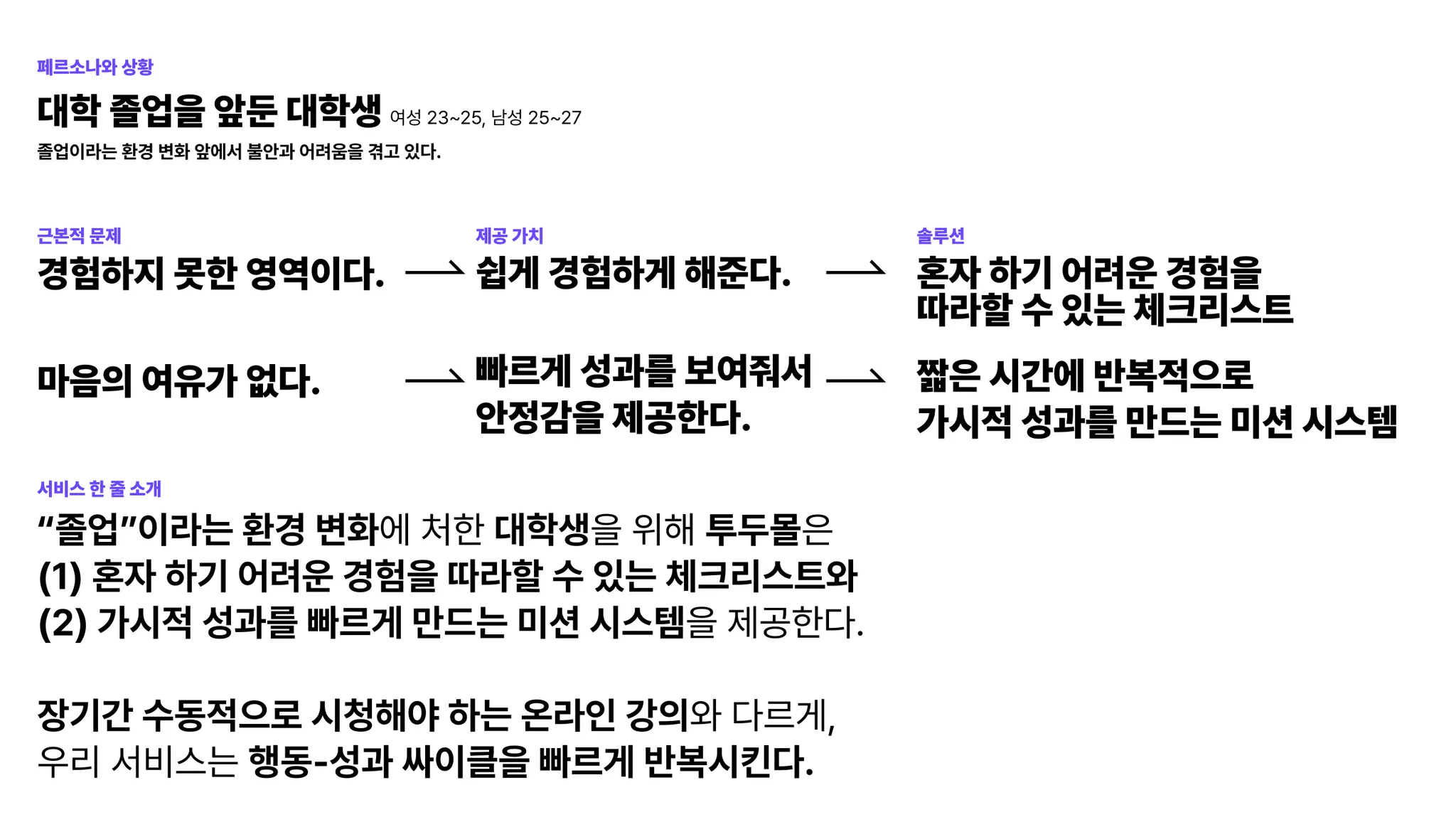 랜딩 페이지 실험, 인터뷰 등에서 수집한 데이터를 종합해 작성한 프로덕트 One page 선언문은 아래와 같았습니다.