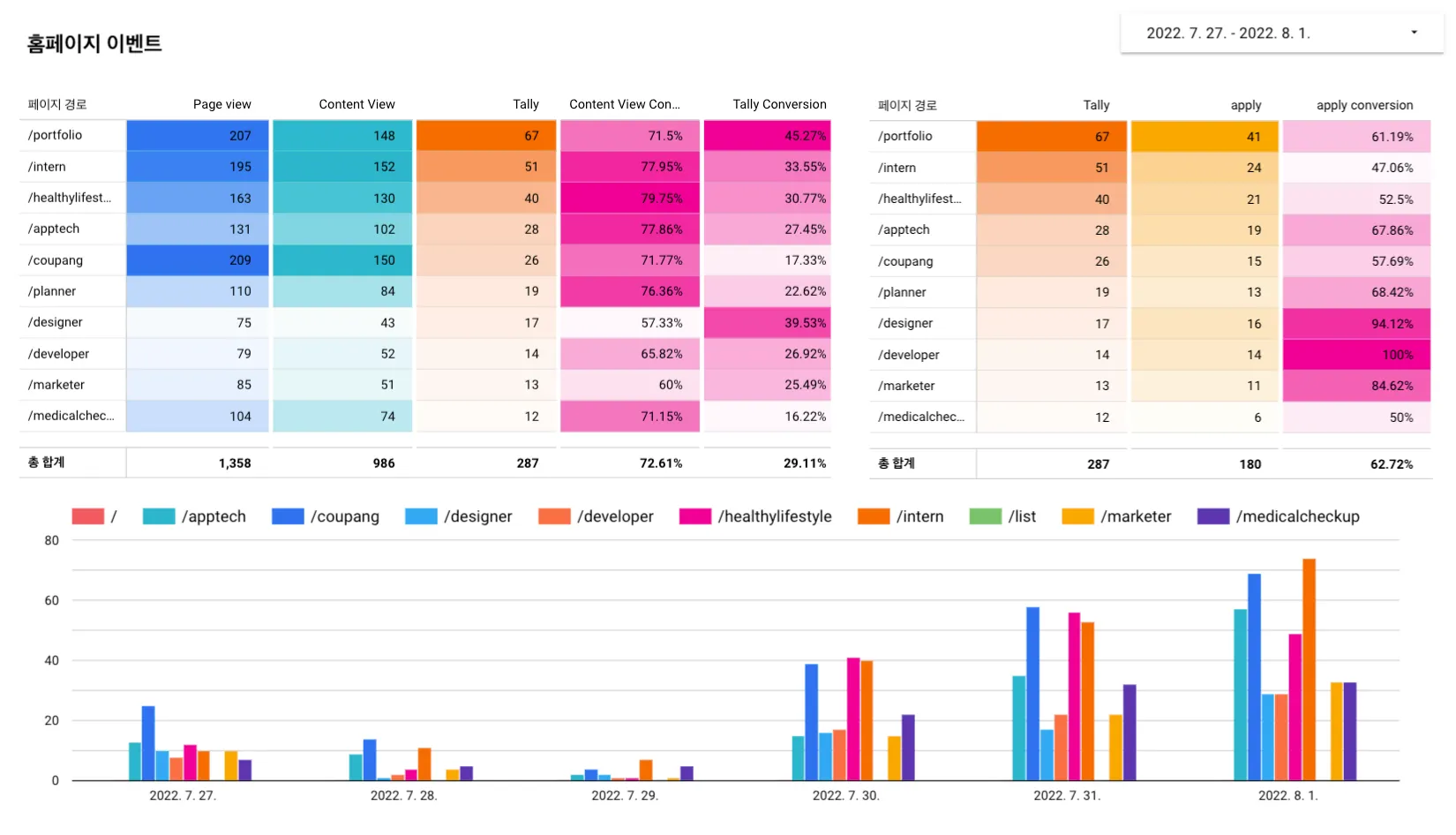 사이트를 배포할 때, 유입 퍼널을 더 쉽게 개선할 수 있도록 대시보드를 구현했습니다.
