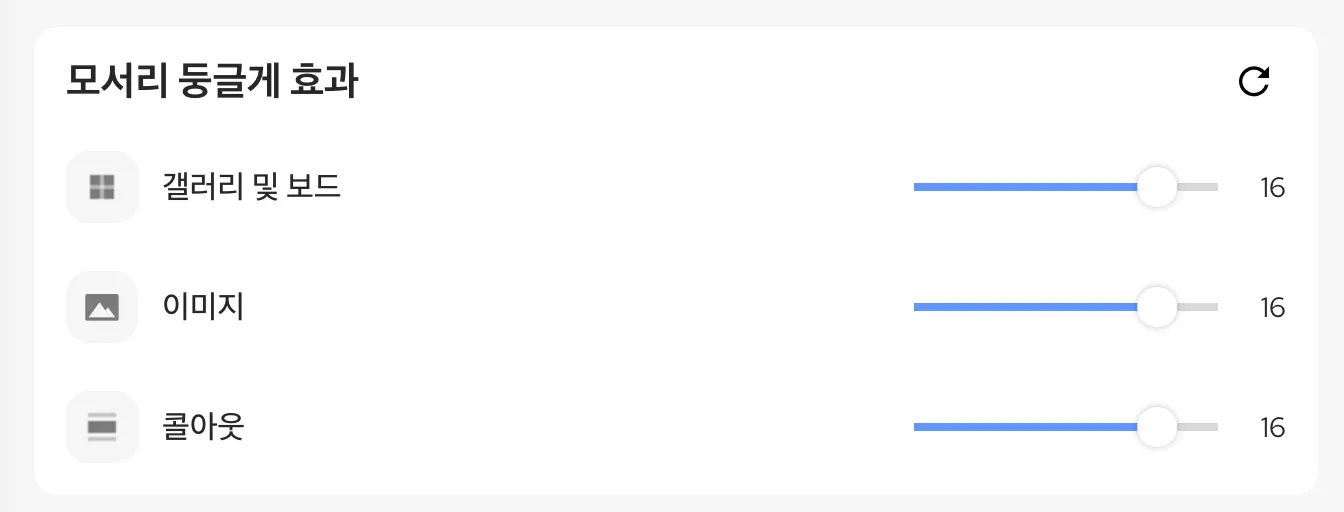 기본 스타일 탭의 모서리 둥글게 효과 영역에서 갤러리와 보드 데이터베이스, 이미지, 콜아웃에 모서리 값을 설정할 수 있습니다.