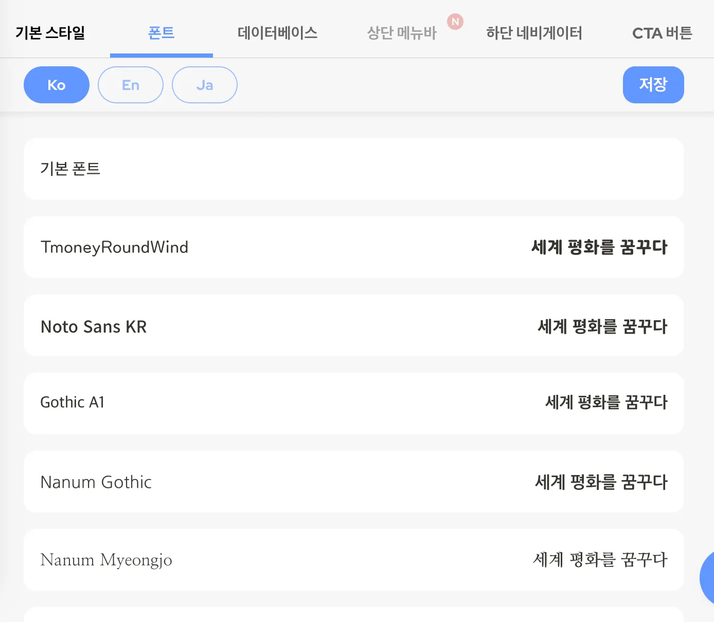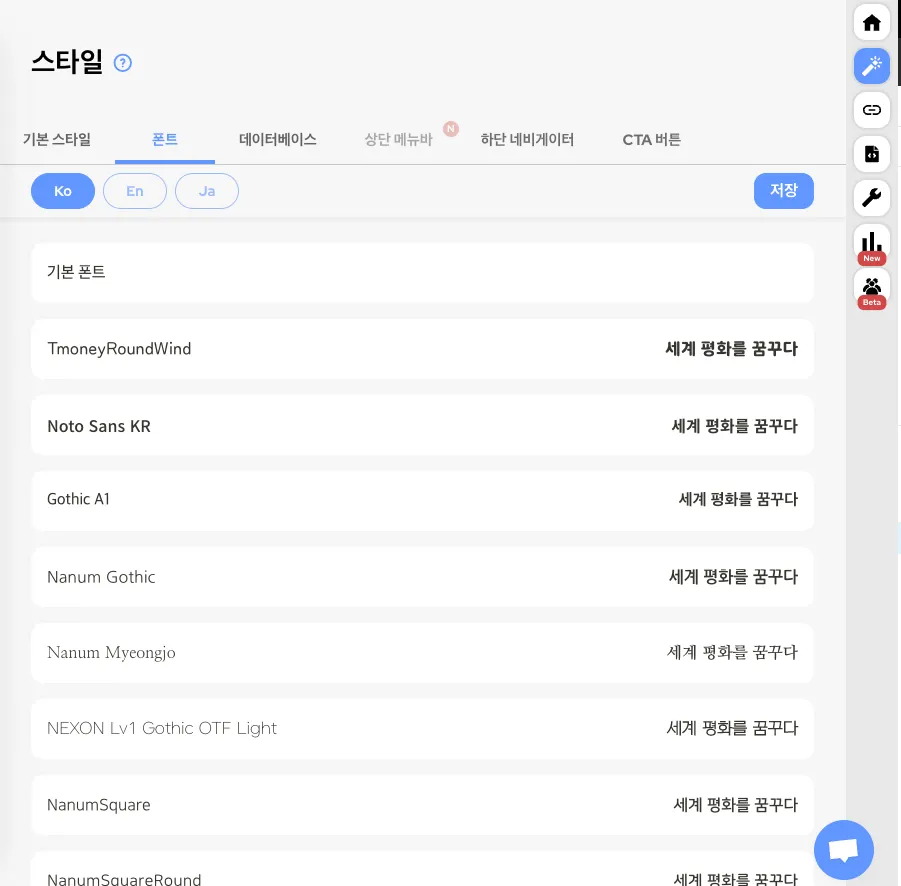폰트 탭에서 사이트의 모든 텍스트에 폰트 스타일을 적용할 수 있습니다.