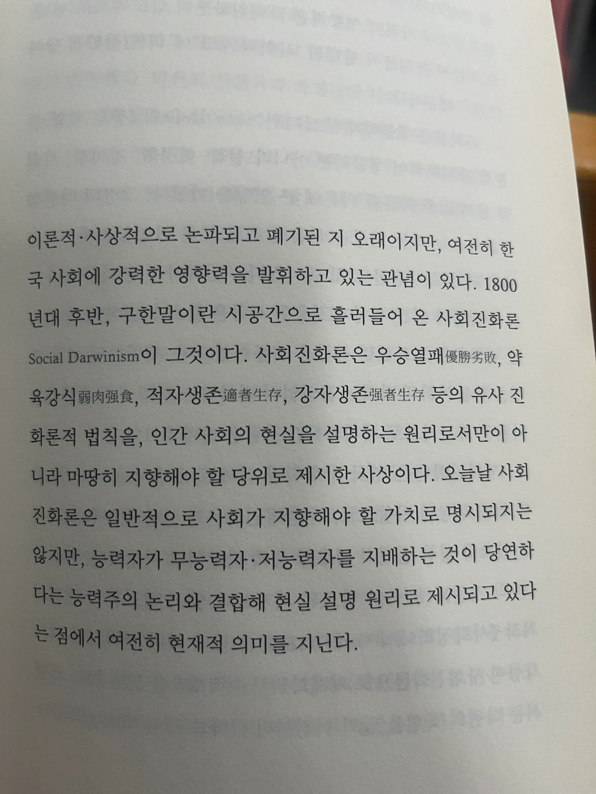 오늘날 사회 진화론은 일반적으로 사회가 지향해야 할 가치로 명시되지는 않지만, 능력자가 무능력자• 저능력자를 지배하는 것이 당연하다는 능력주의 논리와 결합해 현실 설명 원리로 제시되고 있다는 점에서 여전히 현재적 의미를 지닌다.