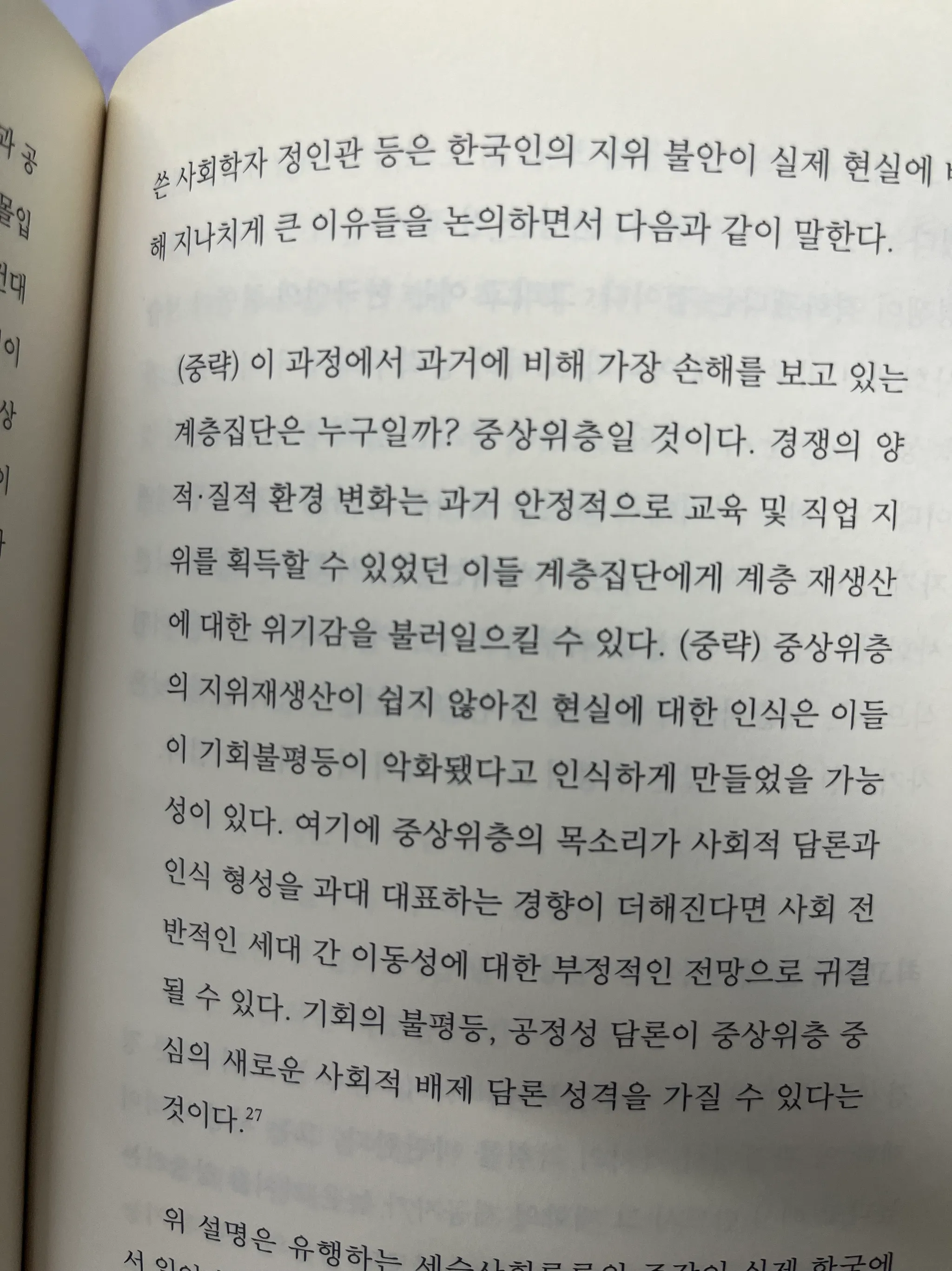 중상위층의 지위재생산이 쉽지 않아진 현실에 대한 인식은 이들 이 기회불평등이 악화됐다고 인식하게 만들었을 가능성이 있다.