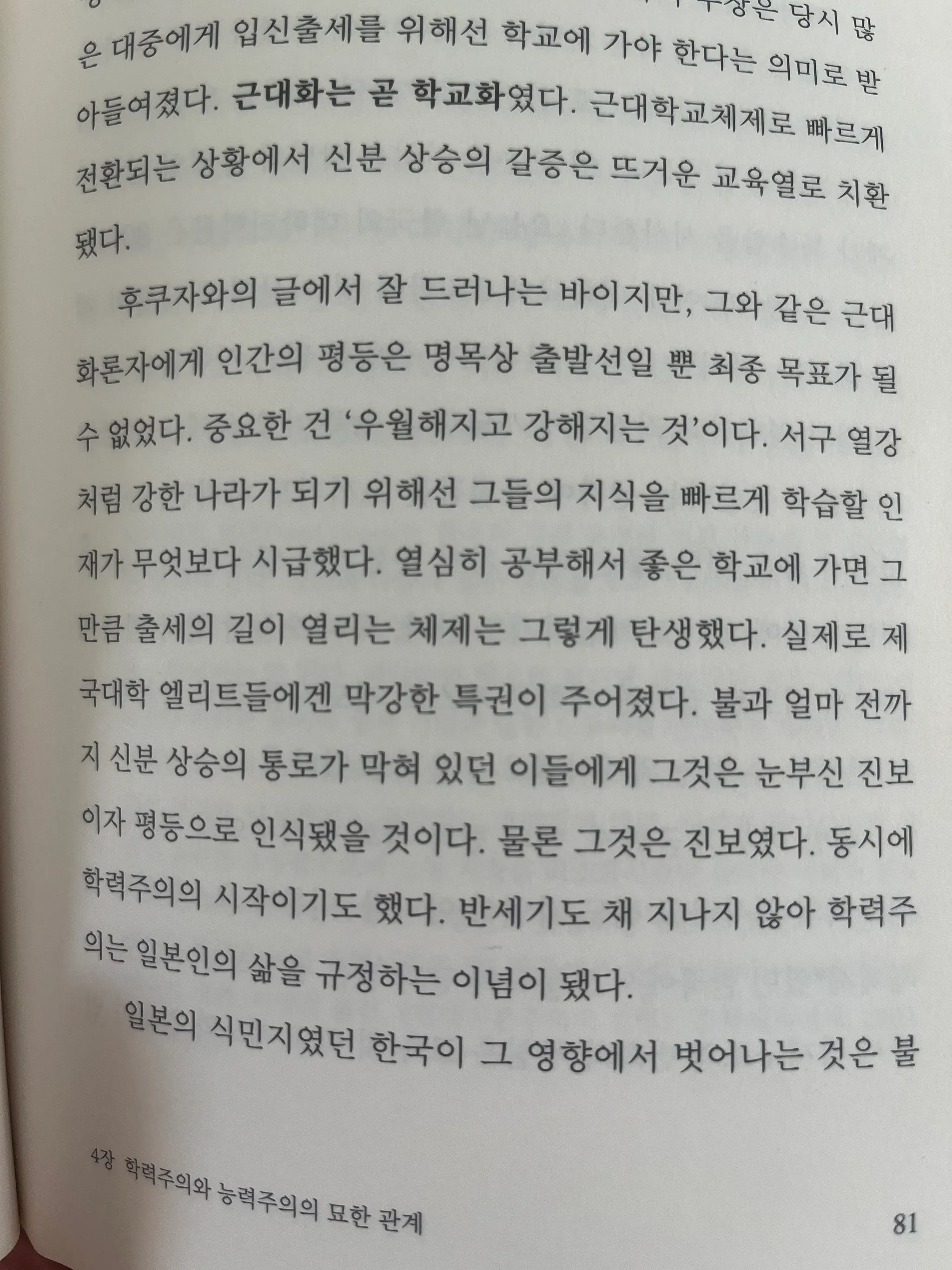 인간은 집단을 만들기 좋아하며, 자신의 집단이 훨씬 우수하길 바란다. 우수하다고 생각하기 위해선, 자집단이 성장하는 방법보다 자기보다 열등하다고 생각하는 집단을 만드는 게 훨씬 편하다. 결과적으로 학력주의는 인간의 욕망에서 비롯되는 게 아닐까