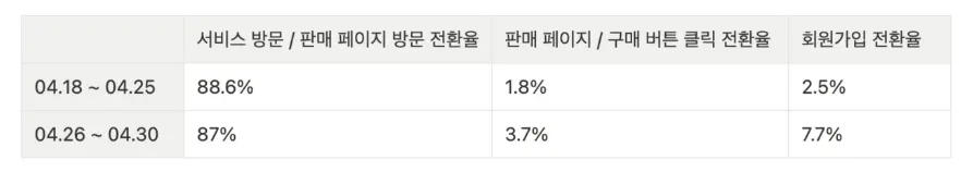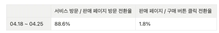 결제 유저를 늘리기 위해서 구매 버튼 클릭 전환율 수치를 높이는 게 효과적이며, 이를 위해 상세 페이지를 개선하기로 했습니다.