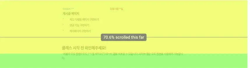 처음에 정의한 문제 가설은 "유저가 학습 콘텐츠 자체에 흥미가 없어서 구매 버튼을 클릭하지 않았을 것이다."였습니다. 하지만, Hotjar를 통해 확인해보니 상세페이지에 접속한 유저 중 70.6%가 끝까지 읽는 걸 확인했습니다.