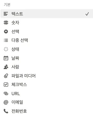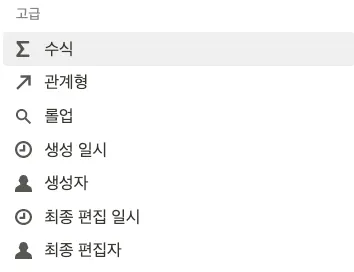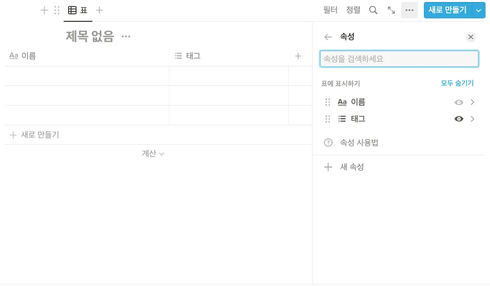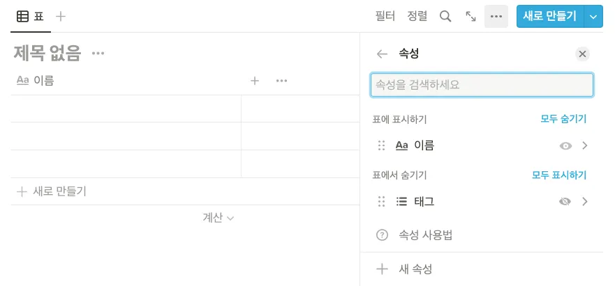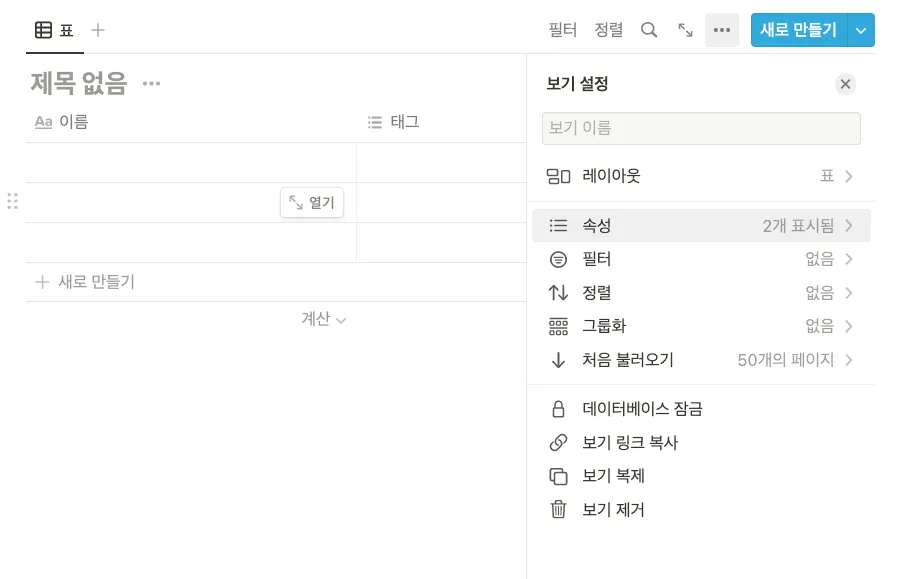 데이터베이스에 속성을 더 추가하고 싶다면, 우측 상단의 설정 아이콘을 눌러서 보기 설정 창을 실행시키고 속성탭으로 이동합니다.