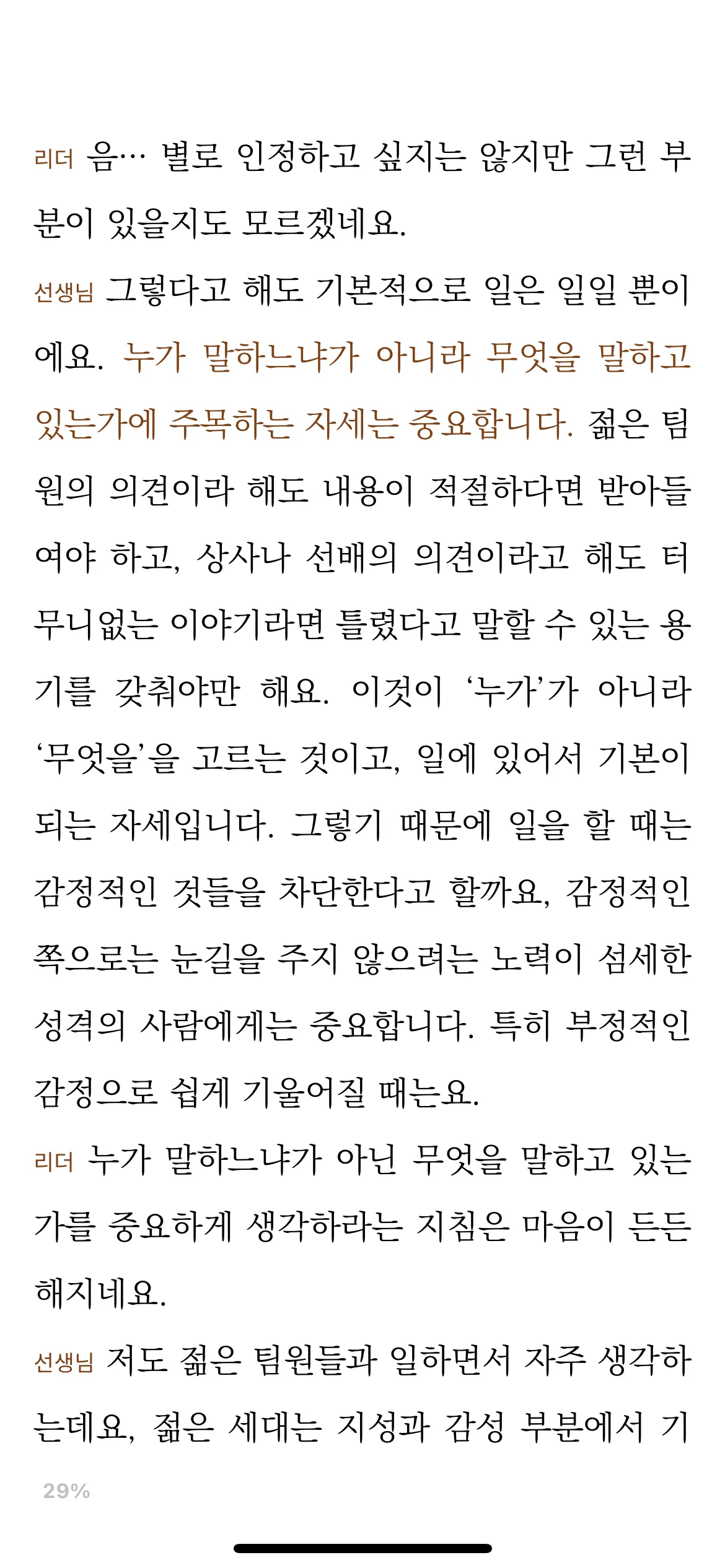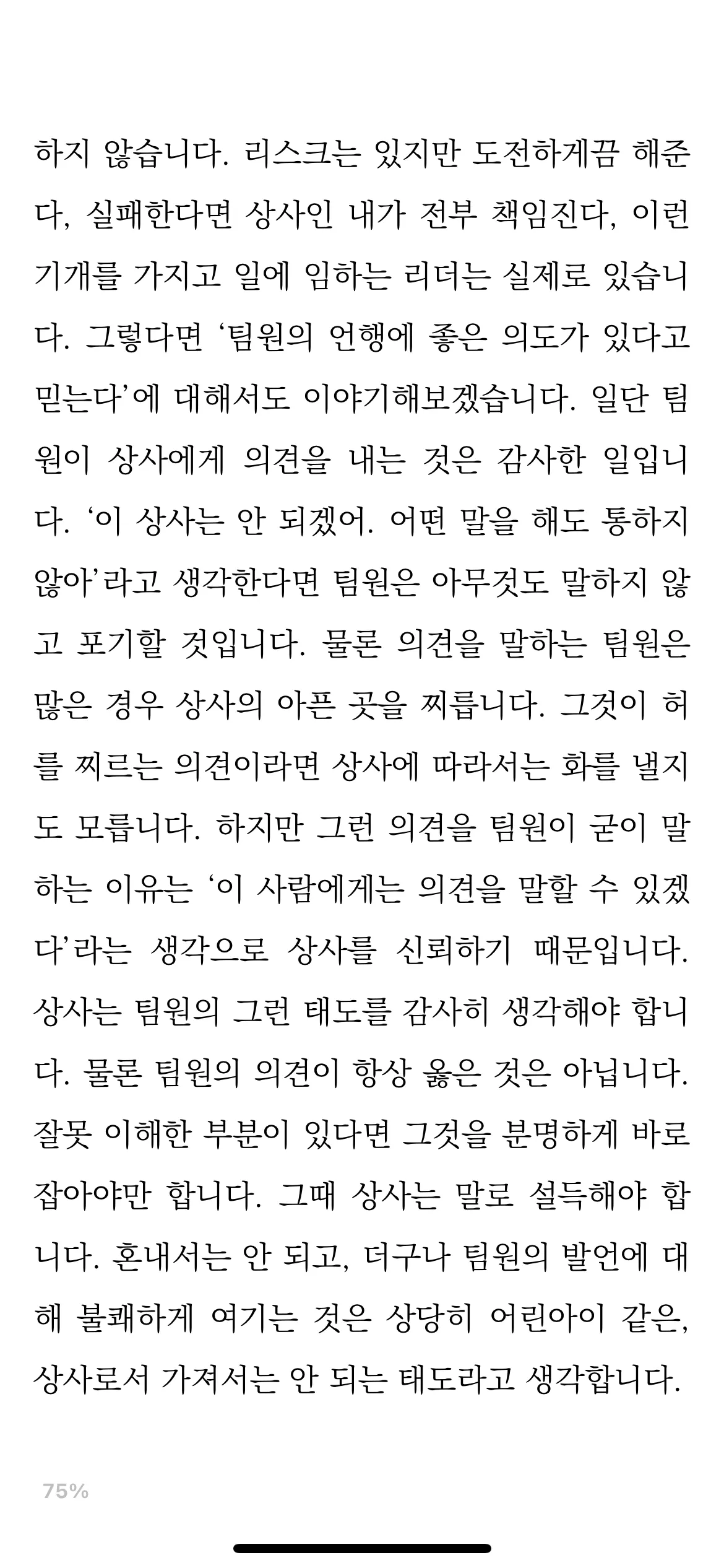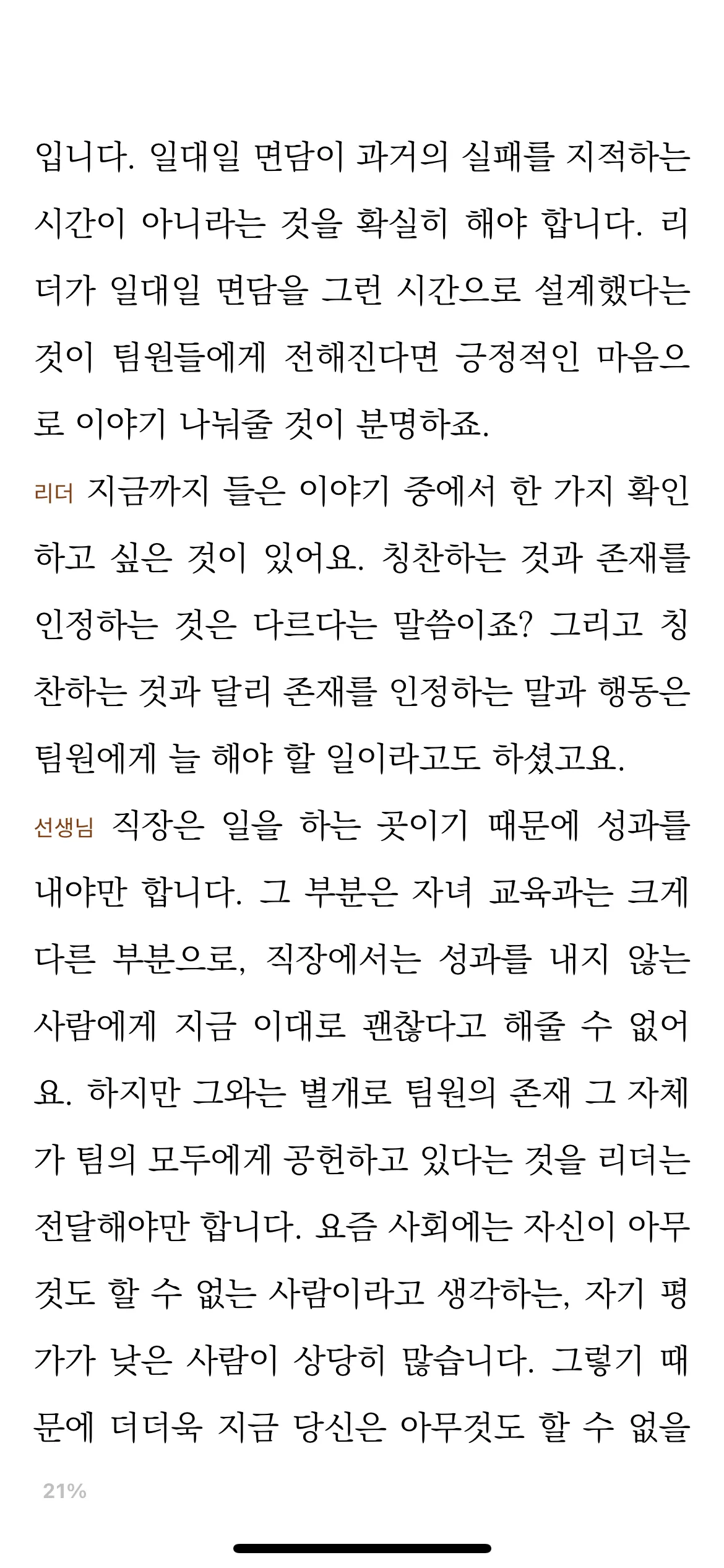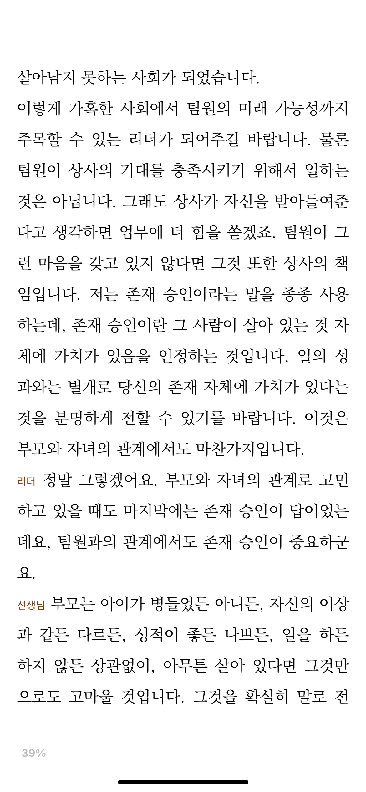 “존재 승인”이란 단어에 이 책이 의미하는 모든 것을 내포하고 있다. 회사에서 리더가 팀원에게 하는 칭찬은 보통 업무와 관련이 있다. 즉, 칭찬의 직접적 대상은 팀원 그 자체가 아닌, 업무의 퍼포먼스에 있다.