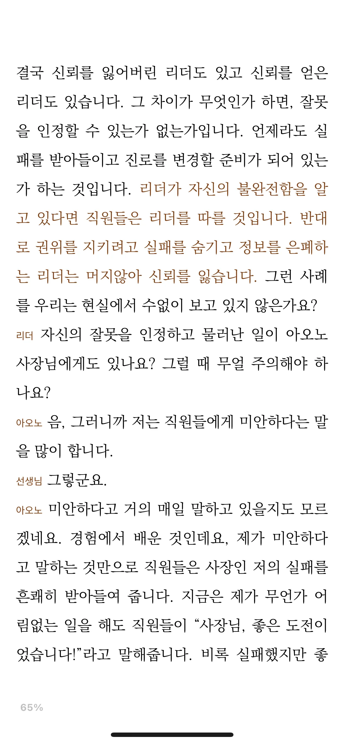 완전한 존재가 되야 한다는 생각은 오히려 리더가 솔직하기 못하게 만든다. 불완전성의 두려움은 리더를 압박 시키고, 결과적으로 자신의 미흡함을 숨기기 위한 비이성적 태도를 갖게 만든다.