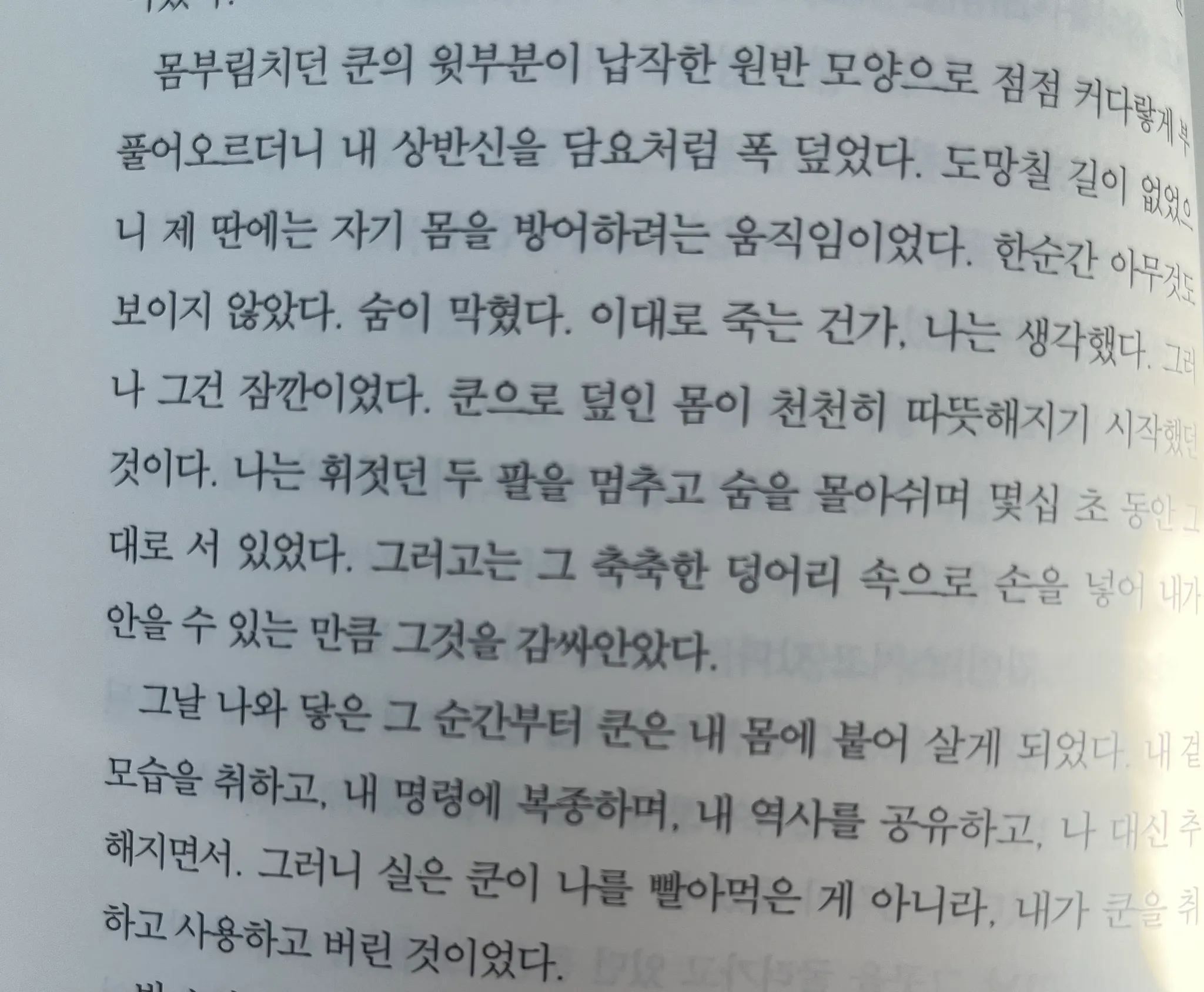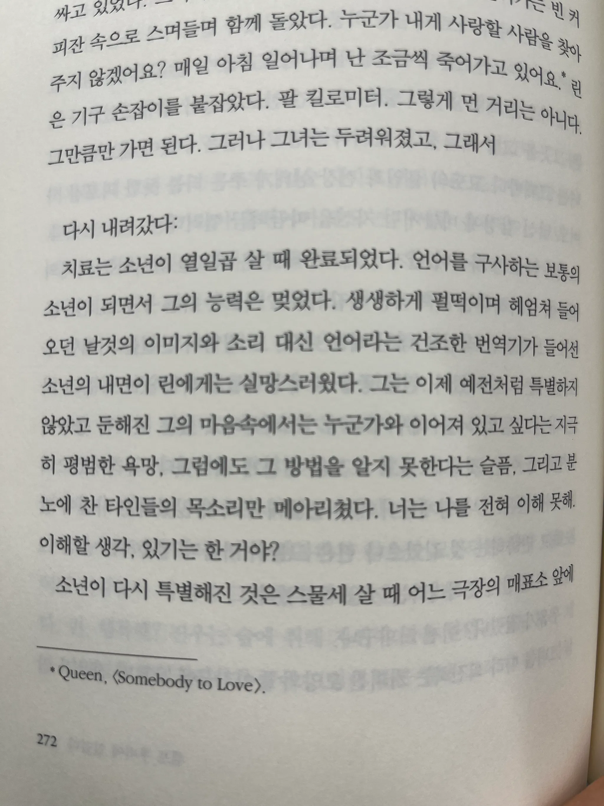 생생하게 펄떡이며 헤엄쳐 들어 오던 날것의 이미지와 소리 대신 언어라는 건조한 번역기가 들어선 소년의 내면이 린에게는 실망스러웠다.