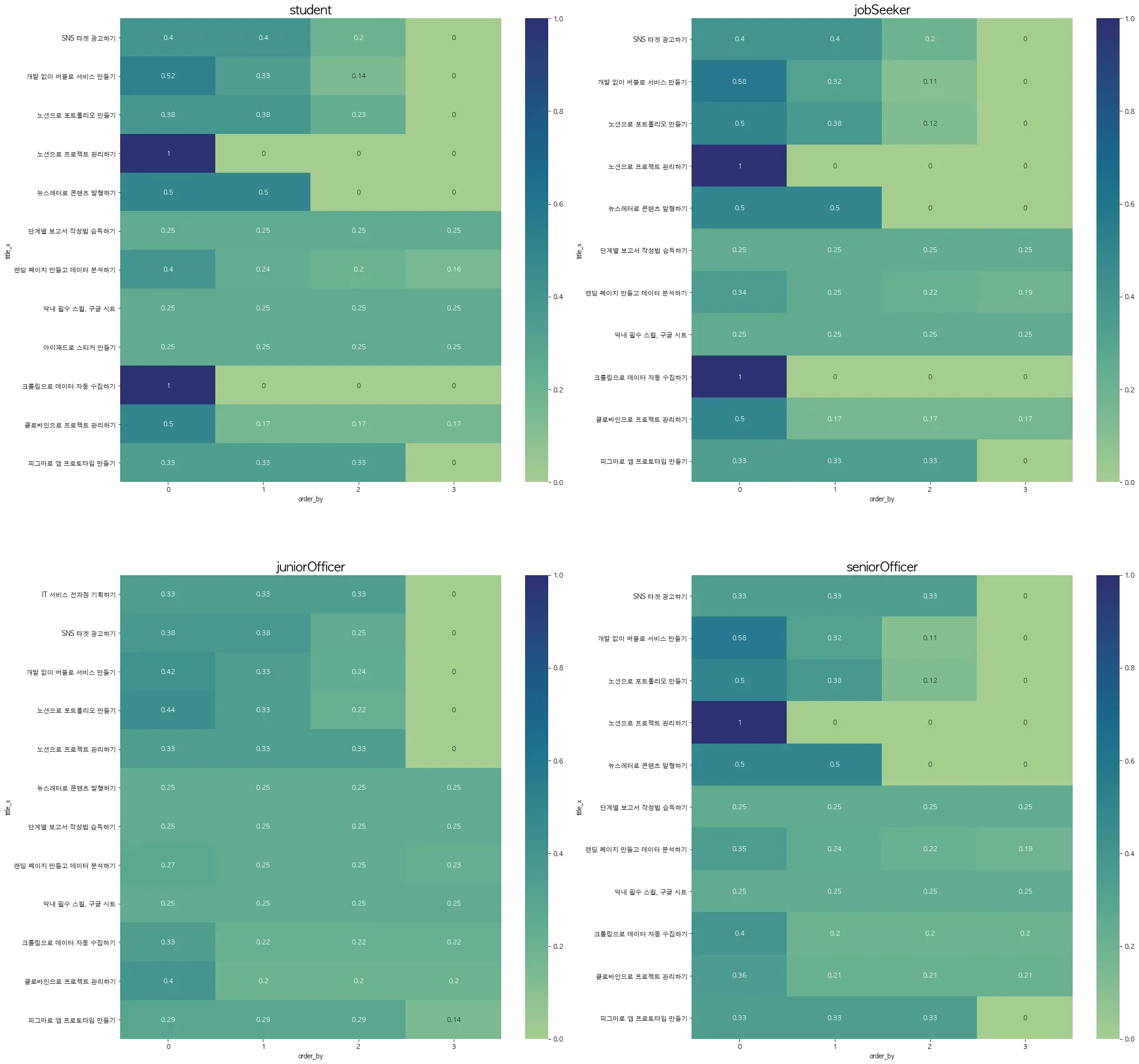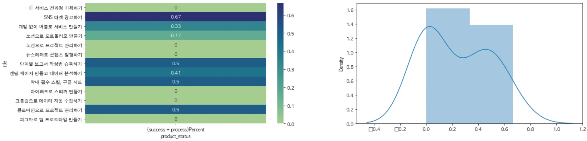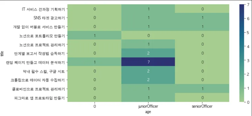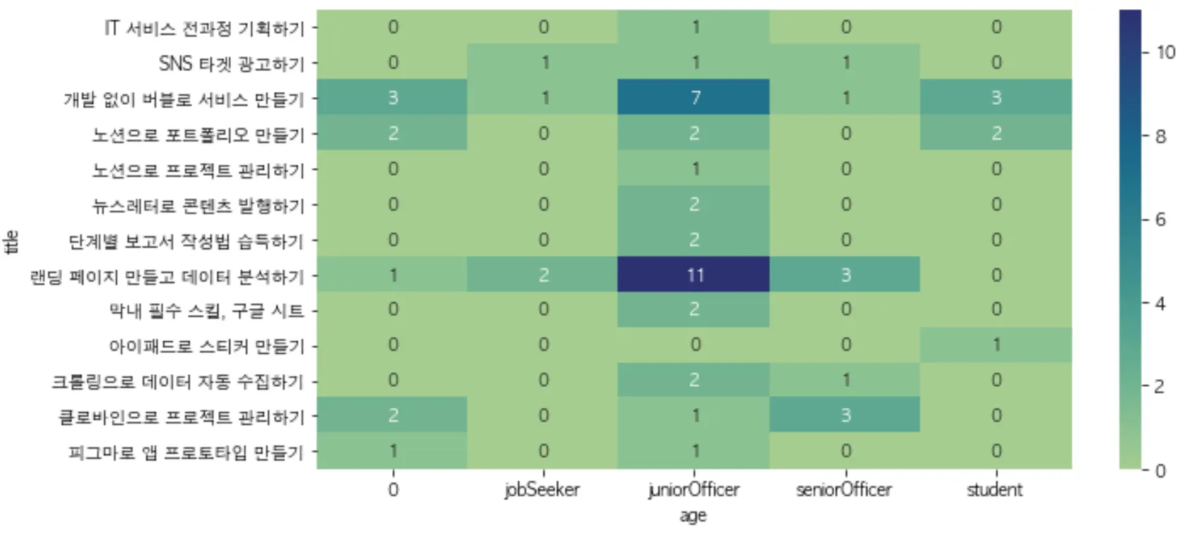 각 유저 세그먼트마다 구매한 클래스를 확인해보니 (1) 개발 없이 버블로 서비스 만들기와 (2) 랜딩 페이지 만들고 데이터 분석하기 클래스가 공통적으로 많이 구매한 걸 확인했습니다. 특히, 타 세그먼트에 비해 주니어 직장인은 여러 유형의 클래스를 구매하는 걸 확인했습니다.