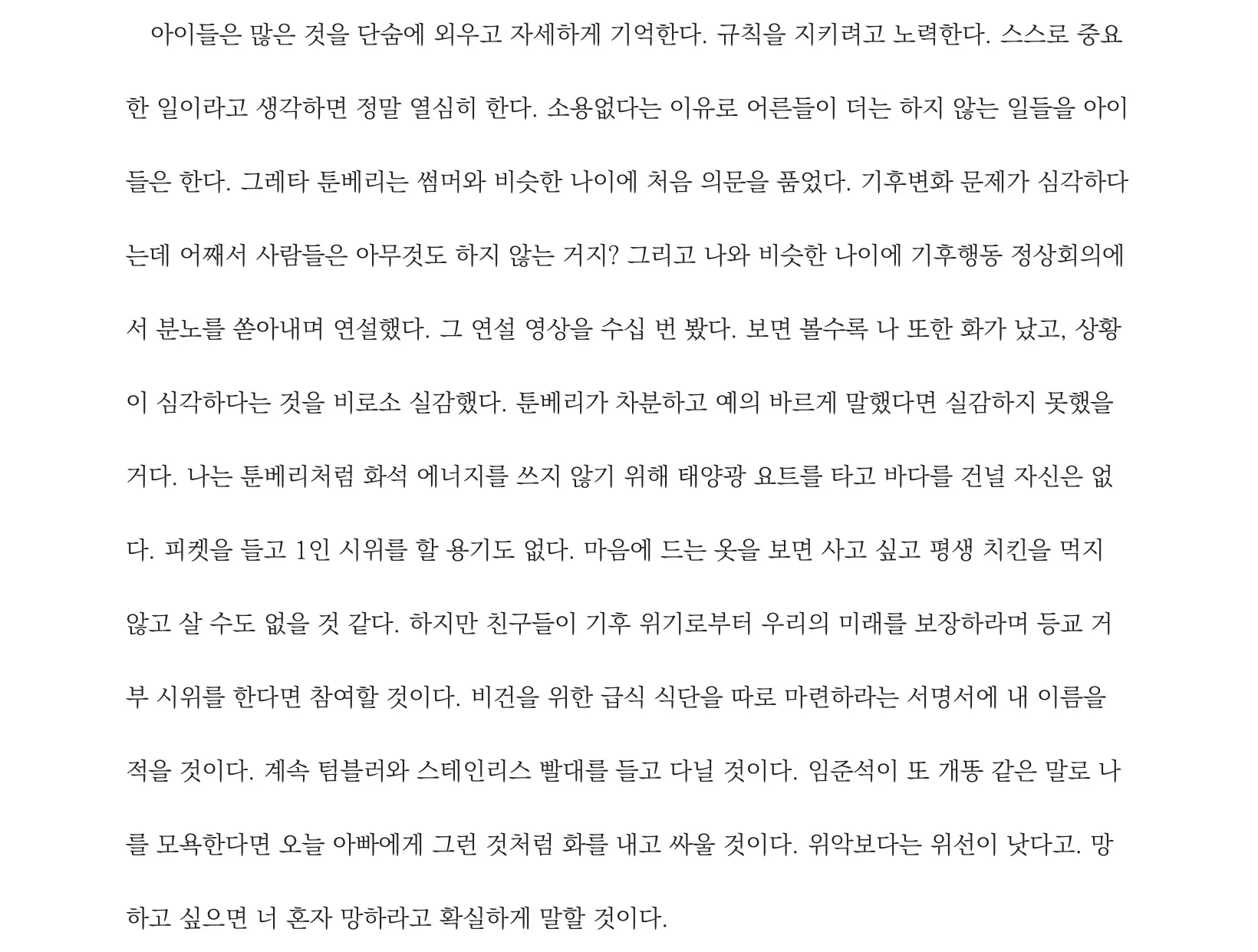 돌이켜보면, 어렸을 때 “해야 하는 일“이라고 배운 것은 주저 없이 했다. 하지만, 나이를 먹을수록 소용 없다고 말하거나, 불확실한 미래를 생각하며 시도하길 주저했다. 해야 하는 일을 주저 없이 행하는 마음이 점점 사라져 가는 게 슬프다. 어른이 아닌, 어린이가 되고 싶다.