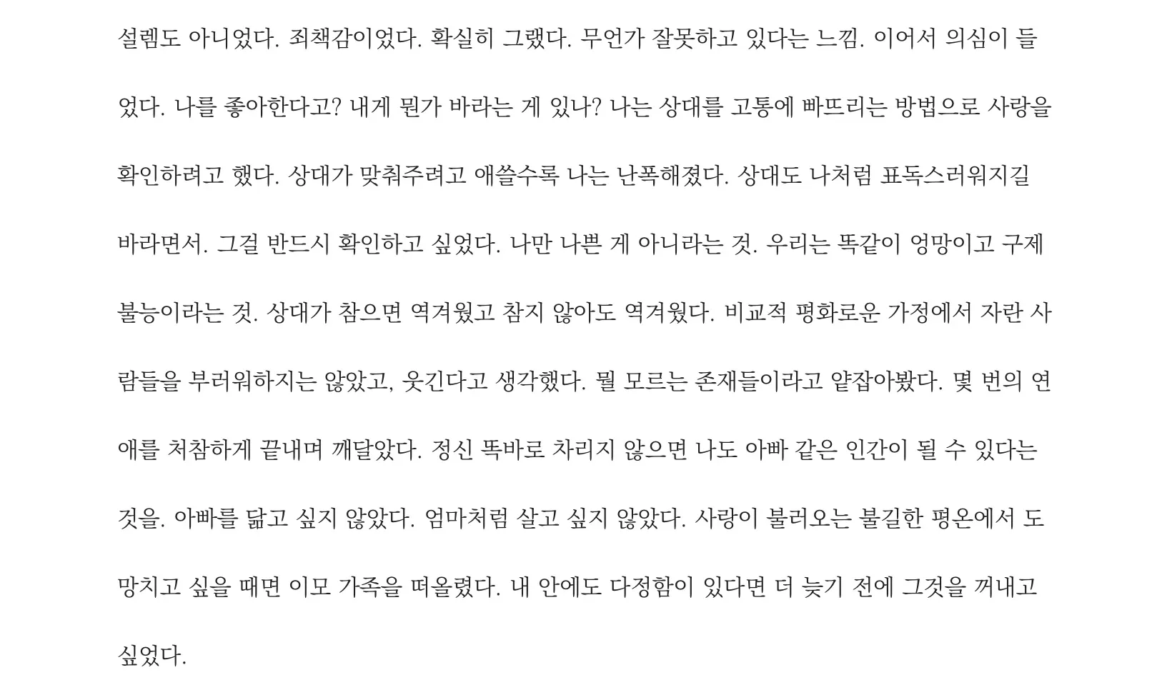 불행을 모으면서 안심하는 사람. 엄마가 원래 그런 사람이었는지는 모르겠다. 어쨌든 그런 사람이 되어버렸다. 엄마는 내가 불행해야 안심할 것이다. 나의 행복을 의심하고 부정할 것이다. 네가 아직 모르는 게 있다고 말할 것이다.