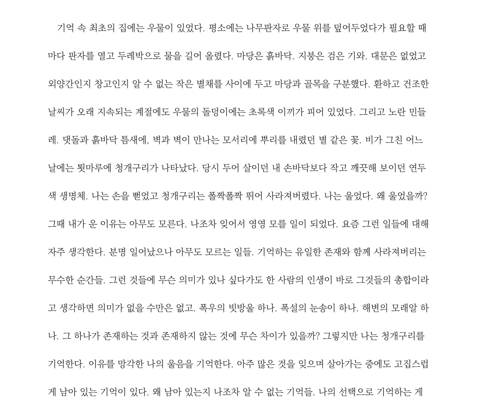 무수한 순간들. 그런 것들에 무슨 의미가 있나 싶다가도 한 사람의 인생이 바로 그것들의 총합이라고 생각하면 의미가 없을 수만은 없고. 폭우의 빗방울 하나. 폭설의 눈송이 하나. 해변의 모래알 하나. 그 하나가 존재하는 것과 존재하지 않는 것에 무슨 차이가 있을까?