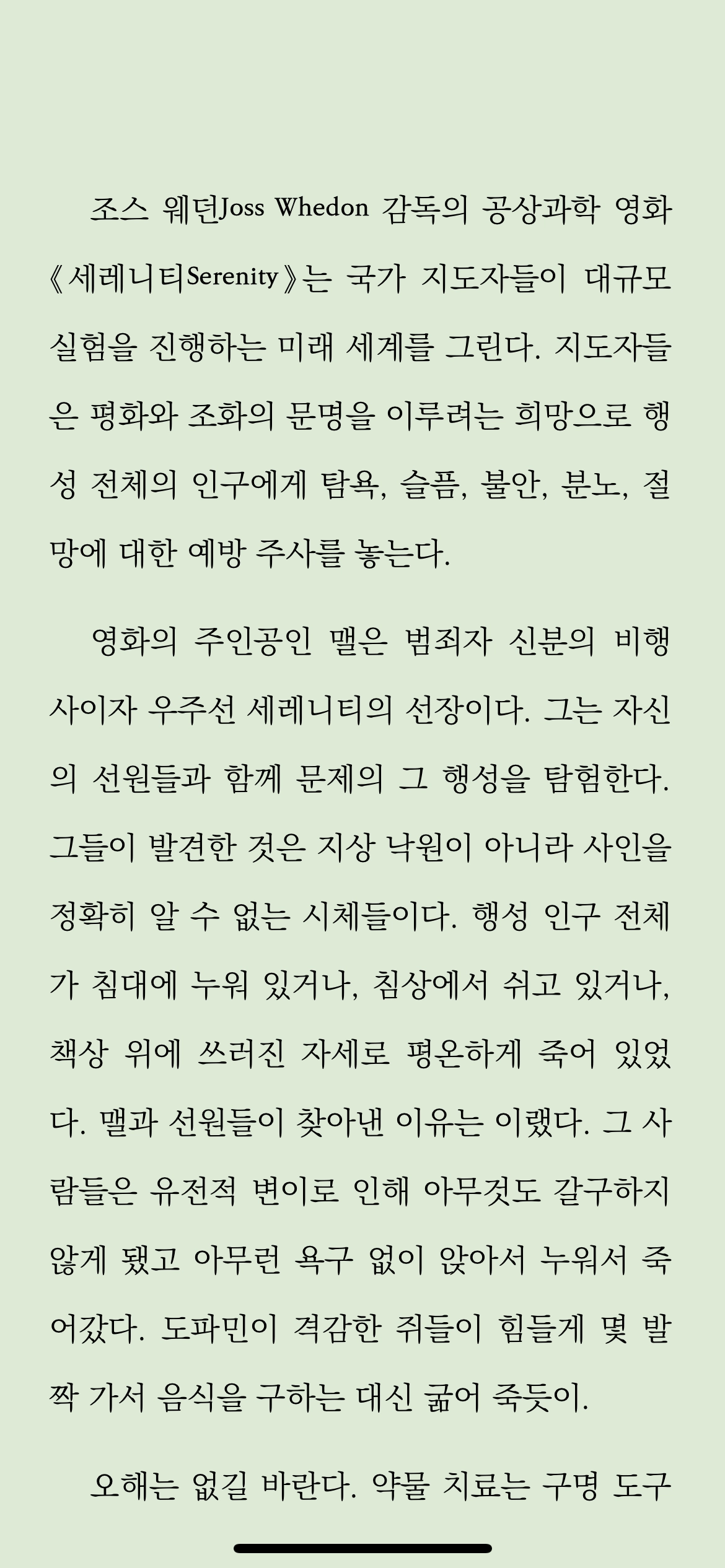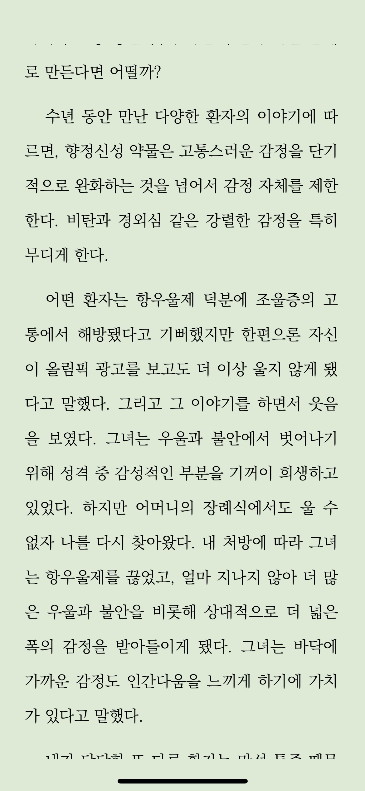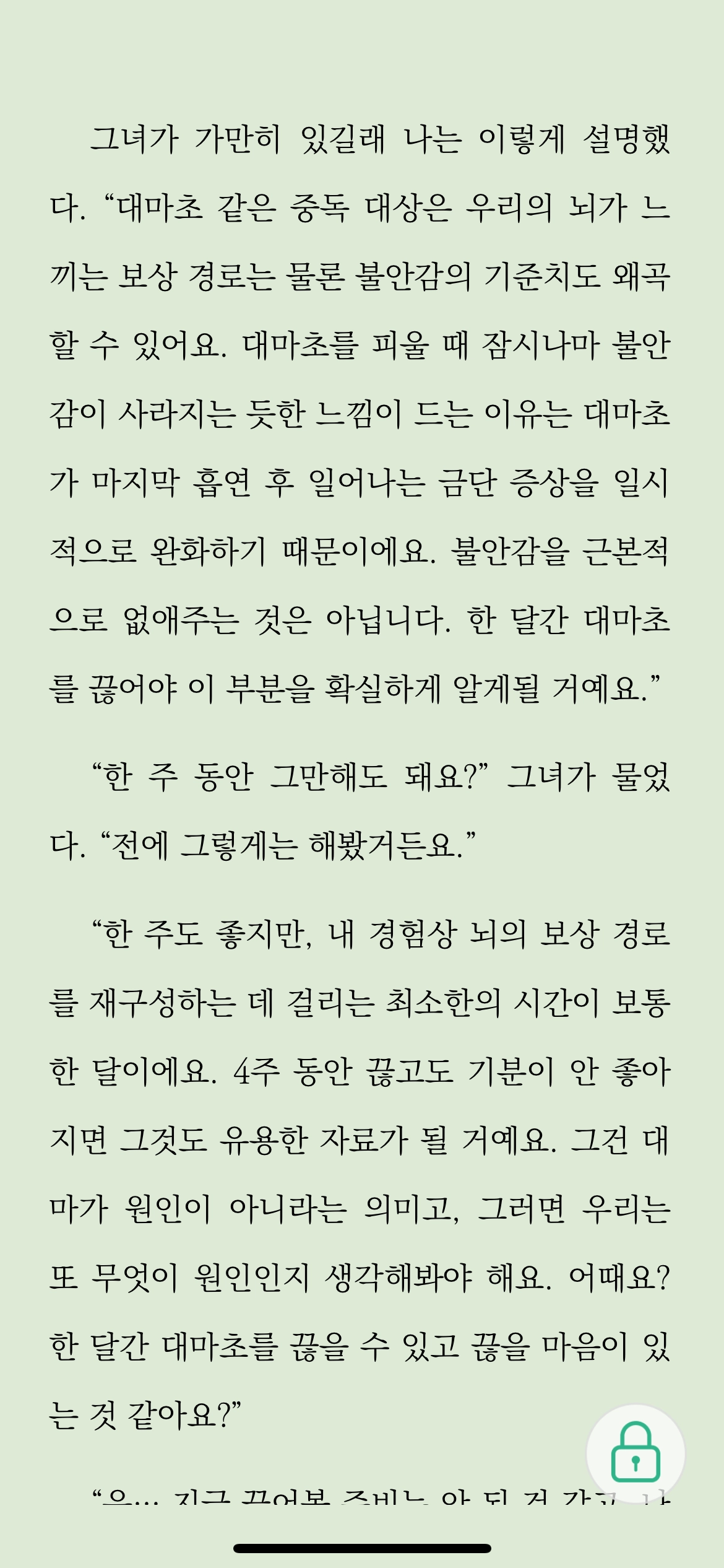 중독의 치료는 자신을 객관적으로 바라보는 것에서 시작한다. 중독 대상은 우리의 불안과 걱정을 일시적으로 없애줄 뿐, 근본적으로 없애지 못한다. 객관적으로 볼 때, 근본적인 치료가 아닌 것을 따를 이유는 없다. 더군다나 일시적인 치료가 불안감의 크기를 점점 더 키운다면, 더더욱 이를 따를 이유가 없다.
