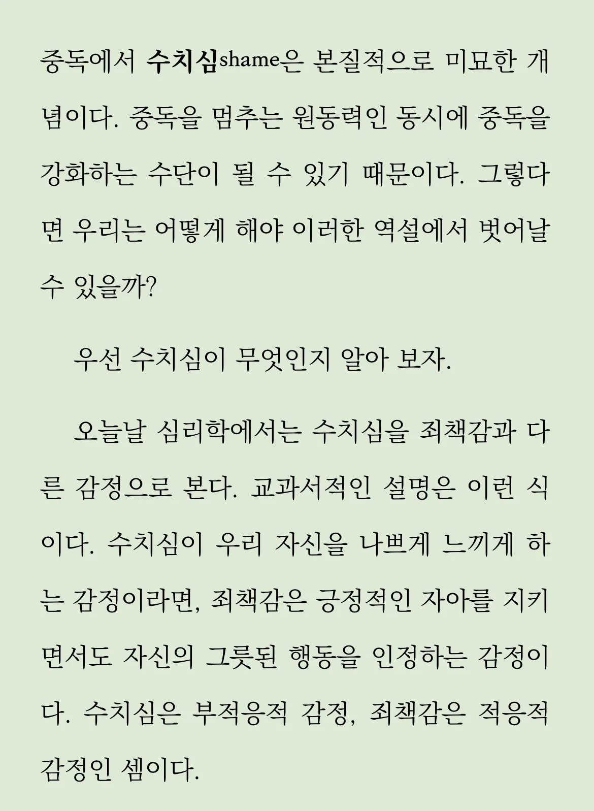 수치심과 죄책감은 다른 감정이다. 죄책감은 자신의 긍정적 자아와 대비되는 모습에서 비롯되는 감정이다. 자신의 긍정적 자아의 인지를 전제로 한다. 반면 수치심은 이러한 자아가 없이 느껴지는 감정이다. 즉, 처음부터 자신의 자아를 부정적으로 인식하고 있는 상태다.