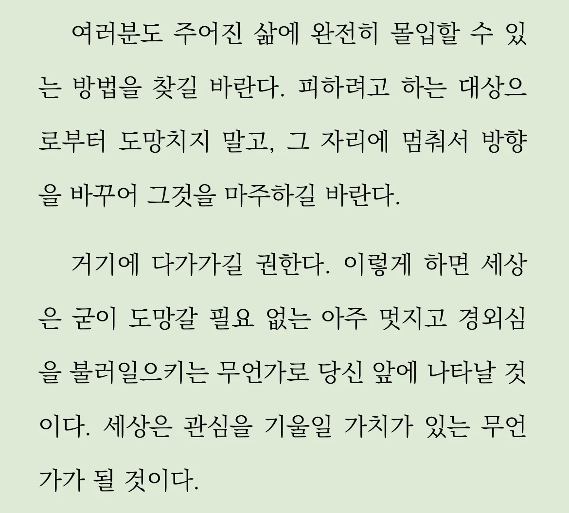 여러분도 주어진 삶에 완전히 몰입할 수 있 는 방법을 찾길 바란다. 피하려고 하는 대상으 로부터 도망치지 말고, 그 자리에 멈춰서 방향 을 바꾸어 그것을 마주하길 바란다.
