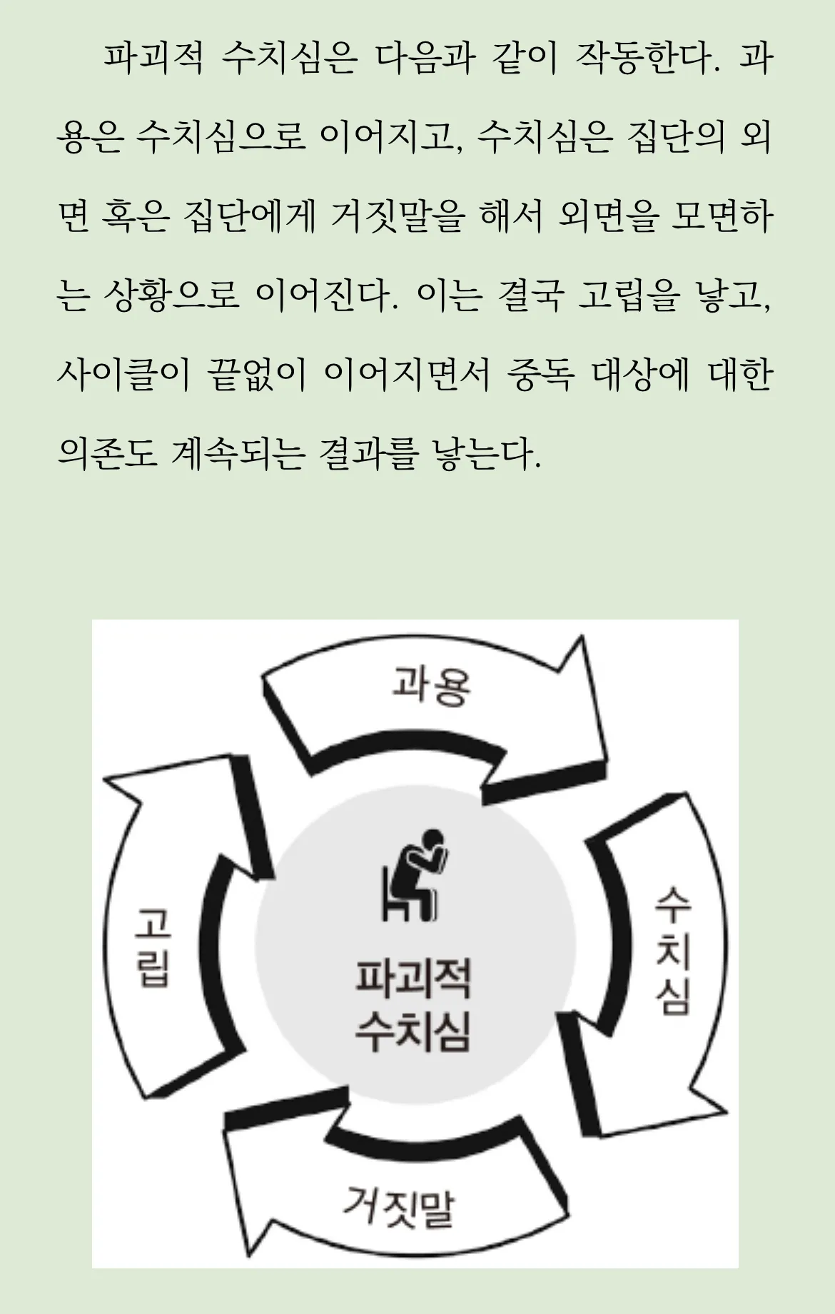 수치심 앞에서 어떤 행동을 하느냐에 따라 중독 대상을 향한 의존도가 달라진다. 이를 받아들이지 못한다면, 주변으로부터 자신을 계속 고립시키게 된다. 결국 혼자가 된 자신은 중독 대상에 더 매달리게 된다.