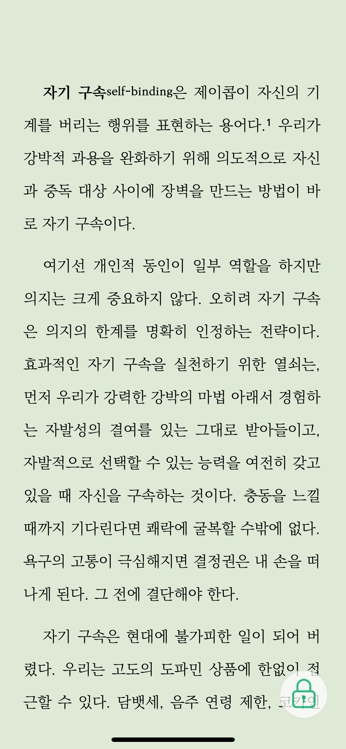 효과적인 자기 구속을 실천하기 위한 열쇠는, 먼저 우리가 강력한 강박의 마법 아래서 경험하 는 자발성의 결여를 있는 그대로 받아들이고, 자발적으로 선택할 수 있는 능력을 여전히 갖고 있을 때 자신을 구속하는 것이다.