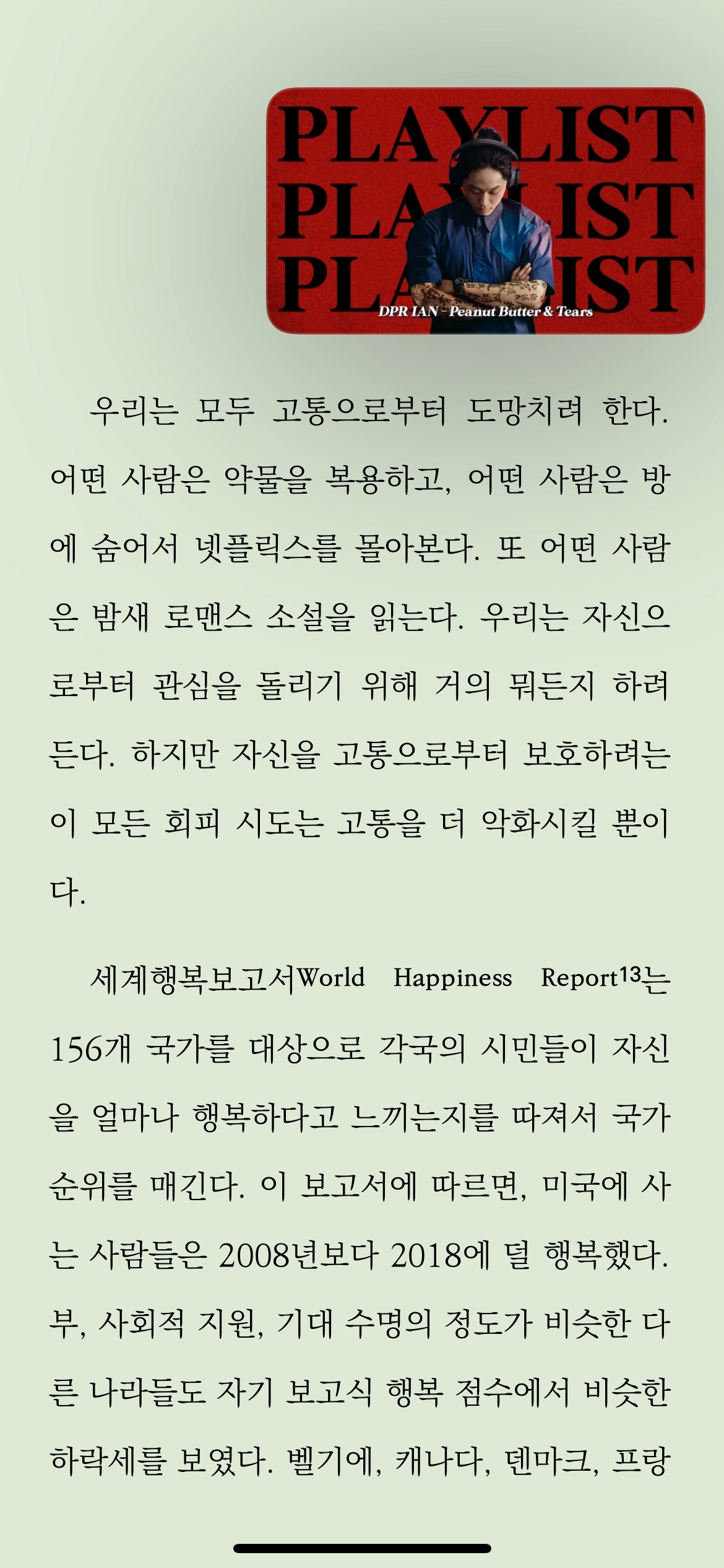 마약 중독자들이 더 강하고 자극적인 약을 찾는 이유는 이전에 먹은 약으로는 현재 쌓인 고통의 양을 넘지 못하기 때문이다. 쾌락과 고통, 둘의 멈추지 않는 치킨 게임이다.