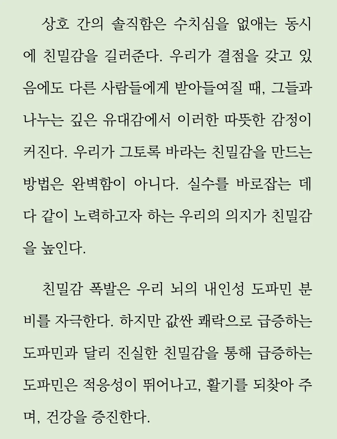 우리가 결점을 갖고 있 음에도 다른 사람들에게 받아들여질 때, 그들과 나누는 깊은 유대감에서 이러한 따뜻한 감정이 커진다. 우리가 그토록 바라는 친밀감을 만드는 방법은 완벽함이 아니다.