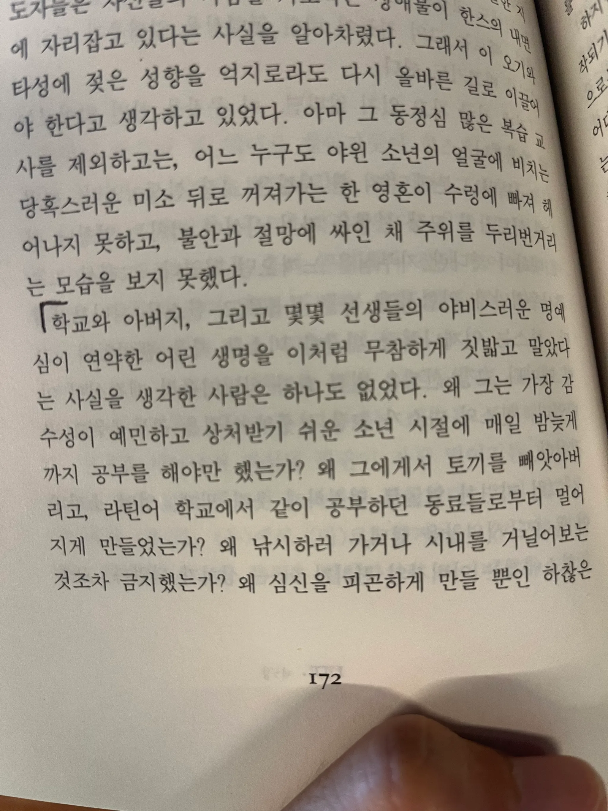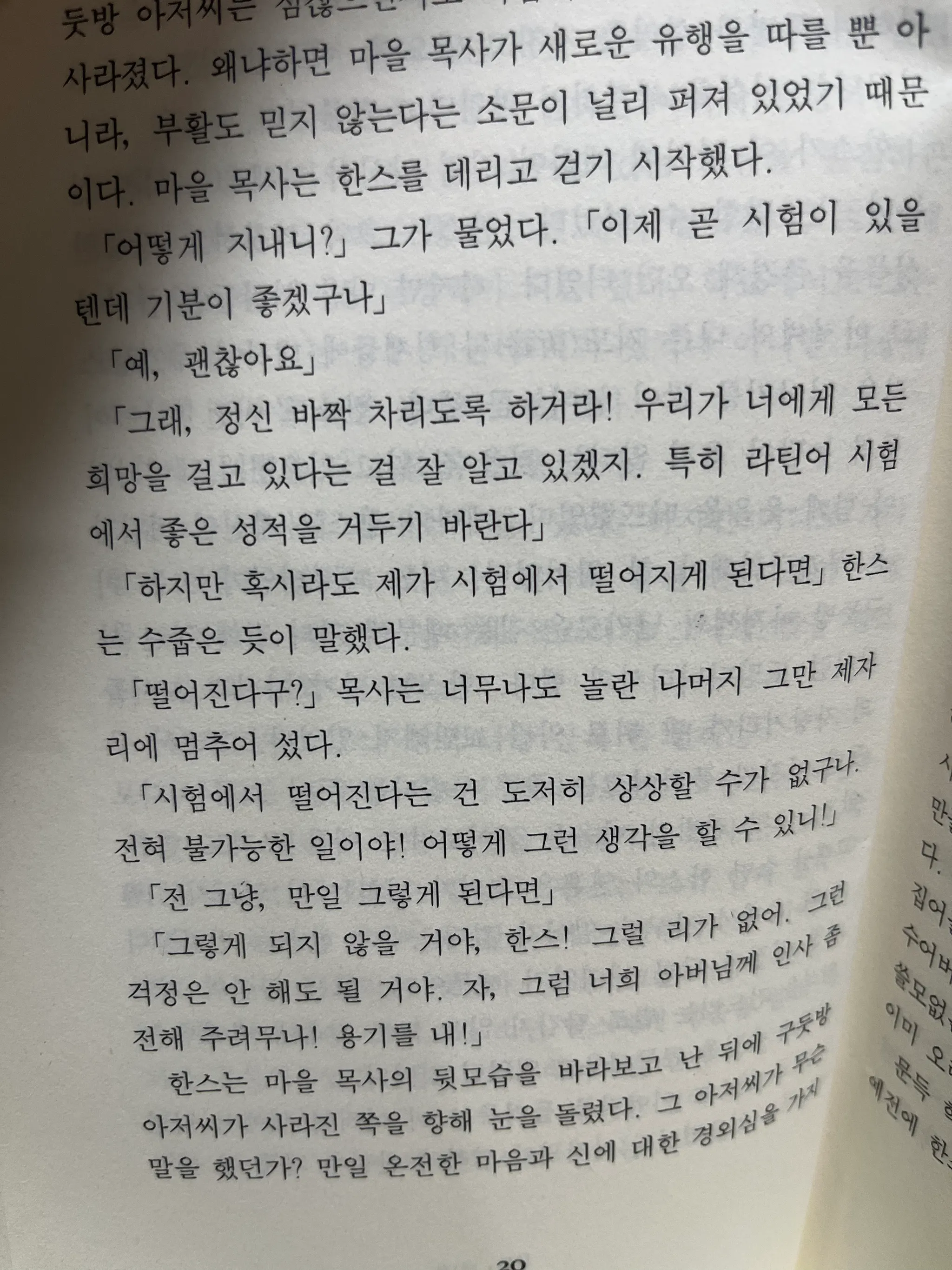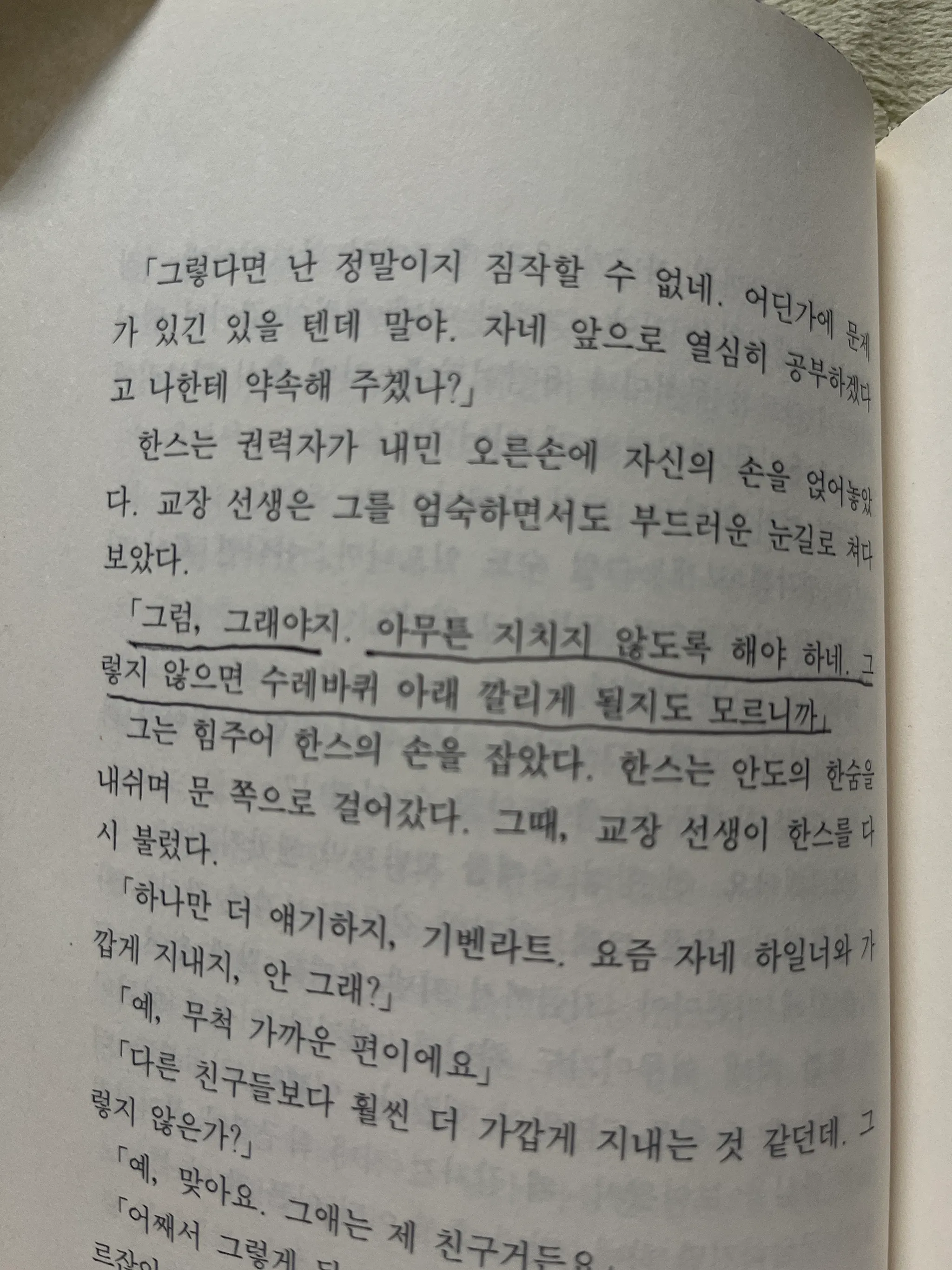 한스의 죽음을 보며, “우리 모두는 저 아이에게 소홀했다”라는 말이 나온다. 이는 작중 내내 한스에게 조언과 충고를 던진 어른들에게 던지는 말이 아닐까? 조언과 충고라는 이름이란 탈로 자신의 욕망과 바램을 투영하지 않는 사람이 되고 싶다.