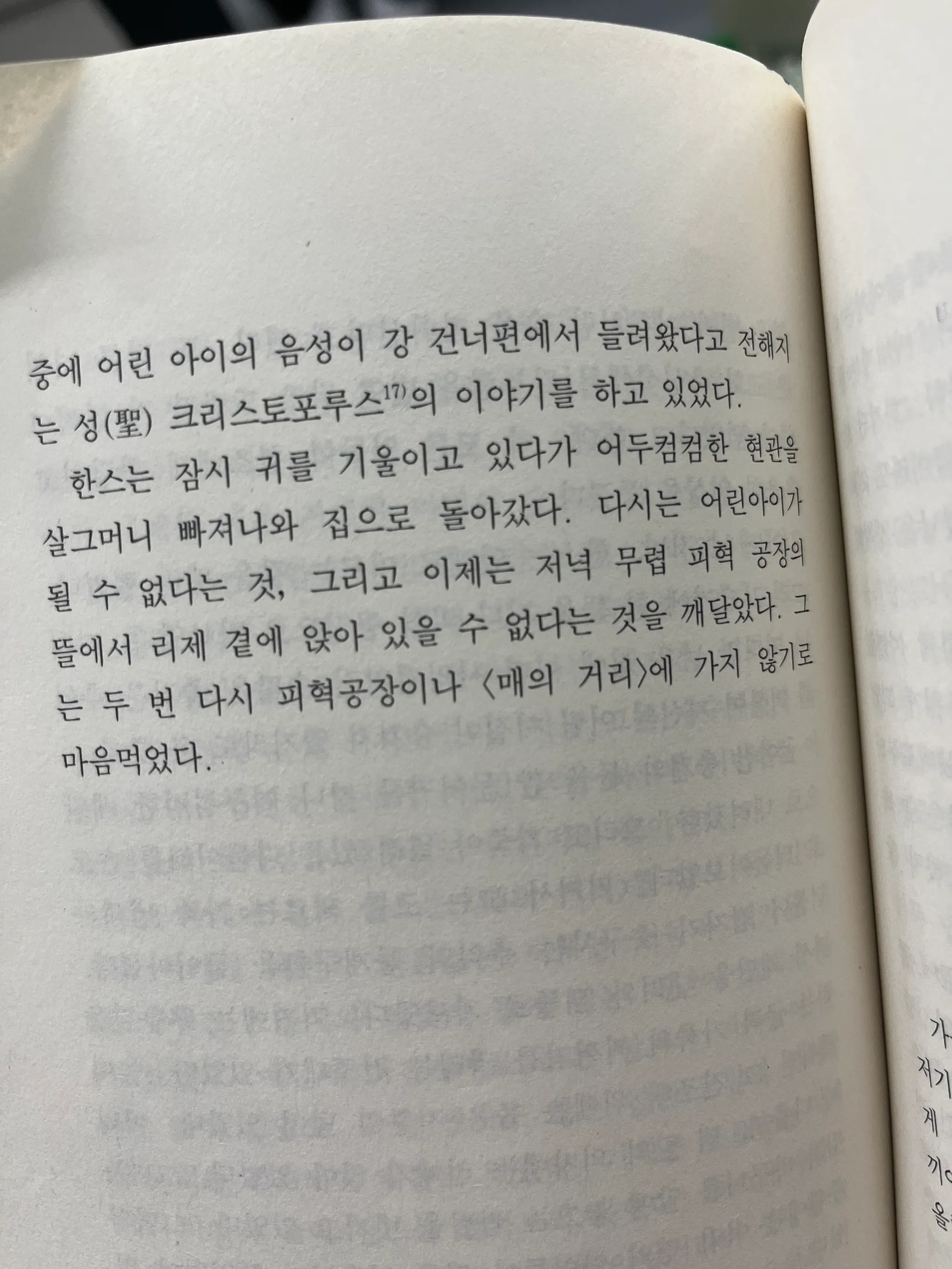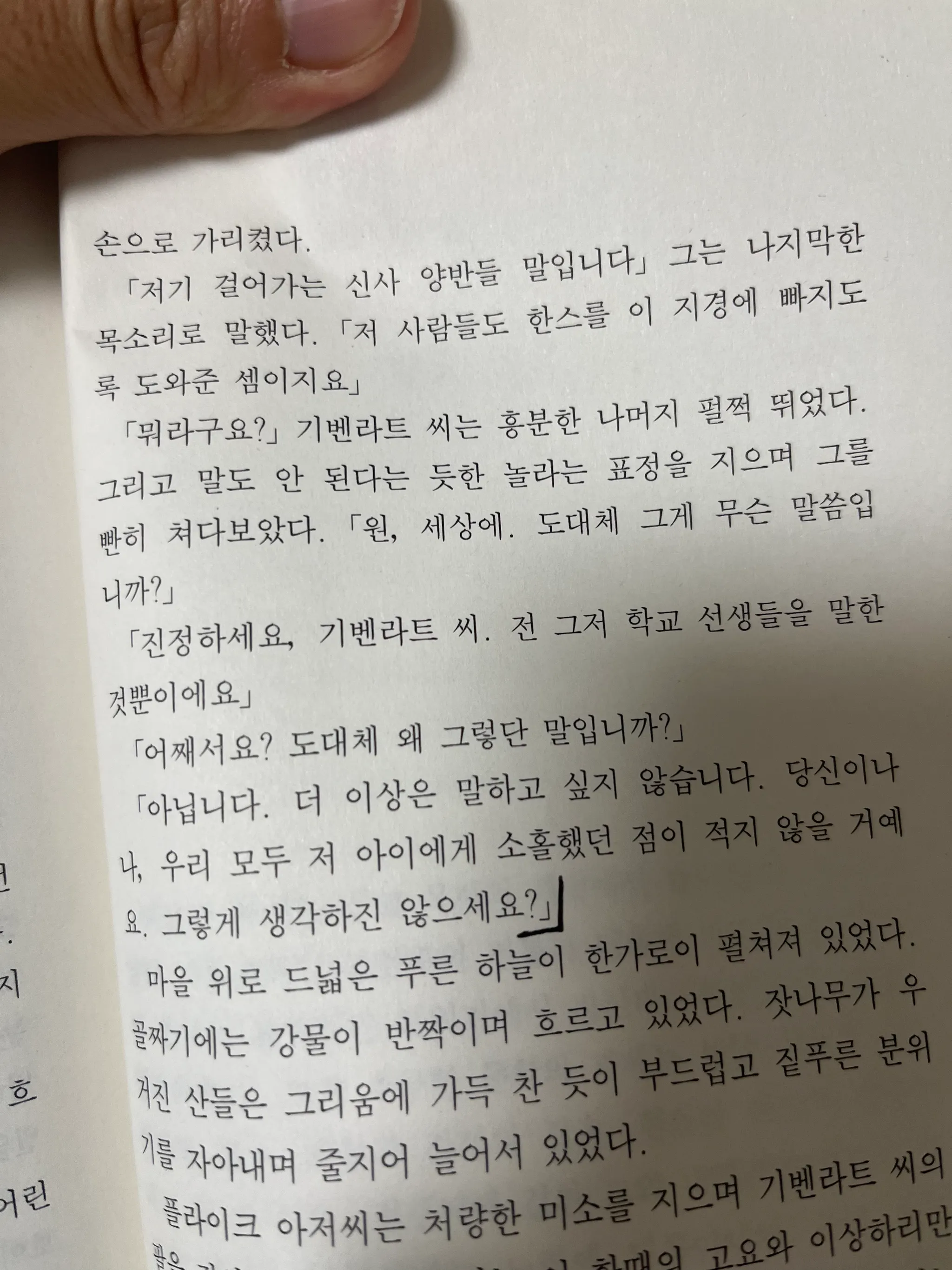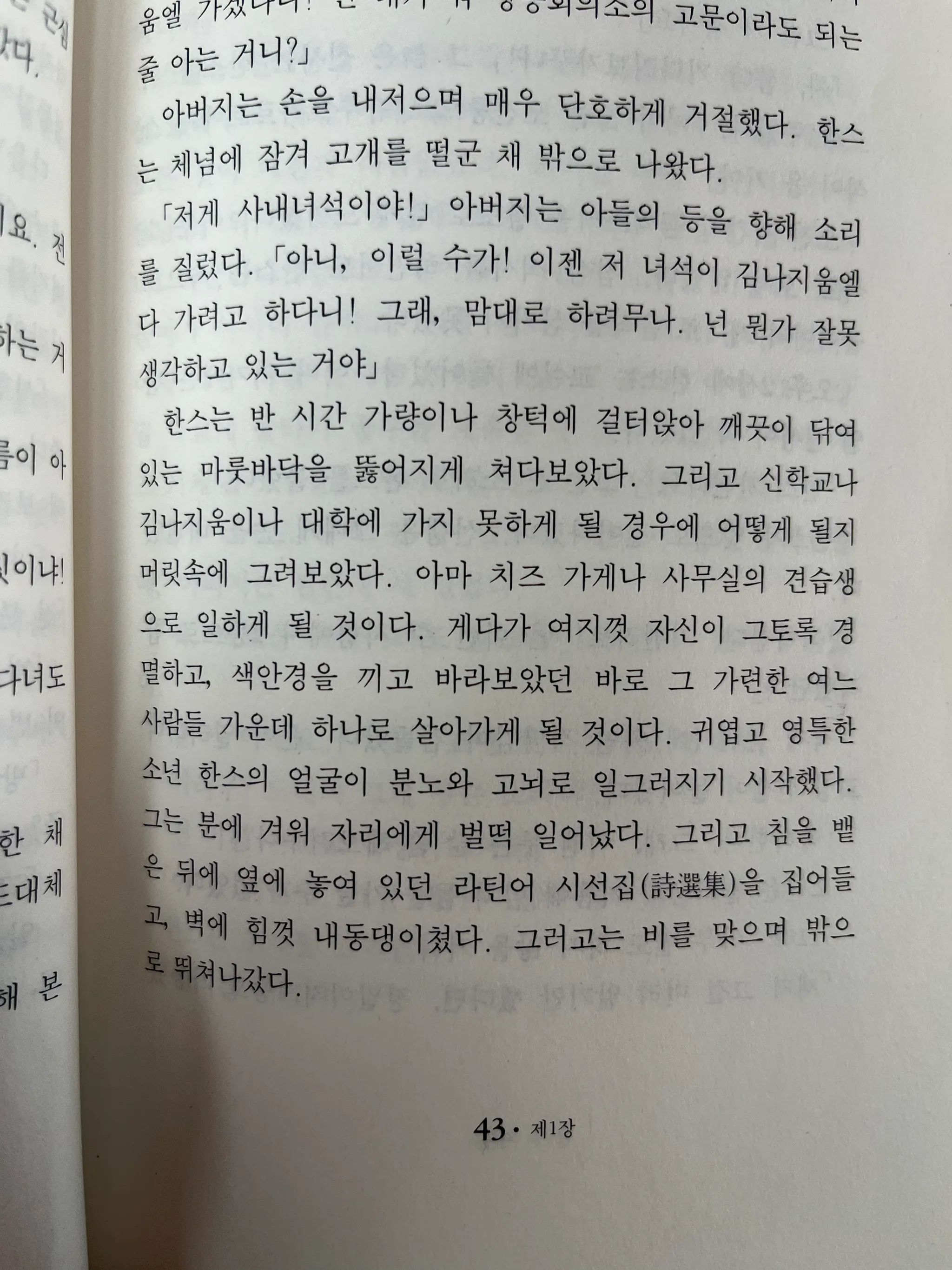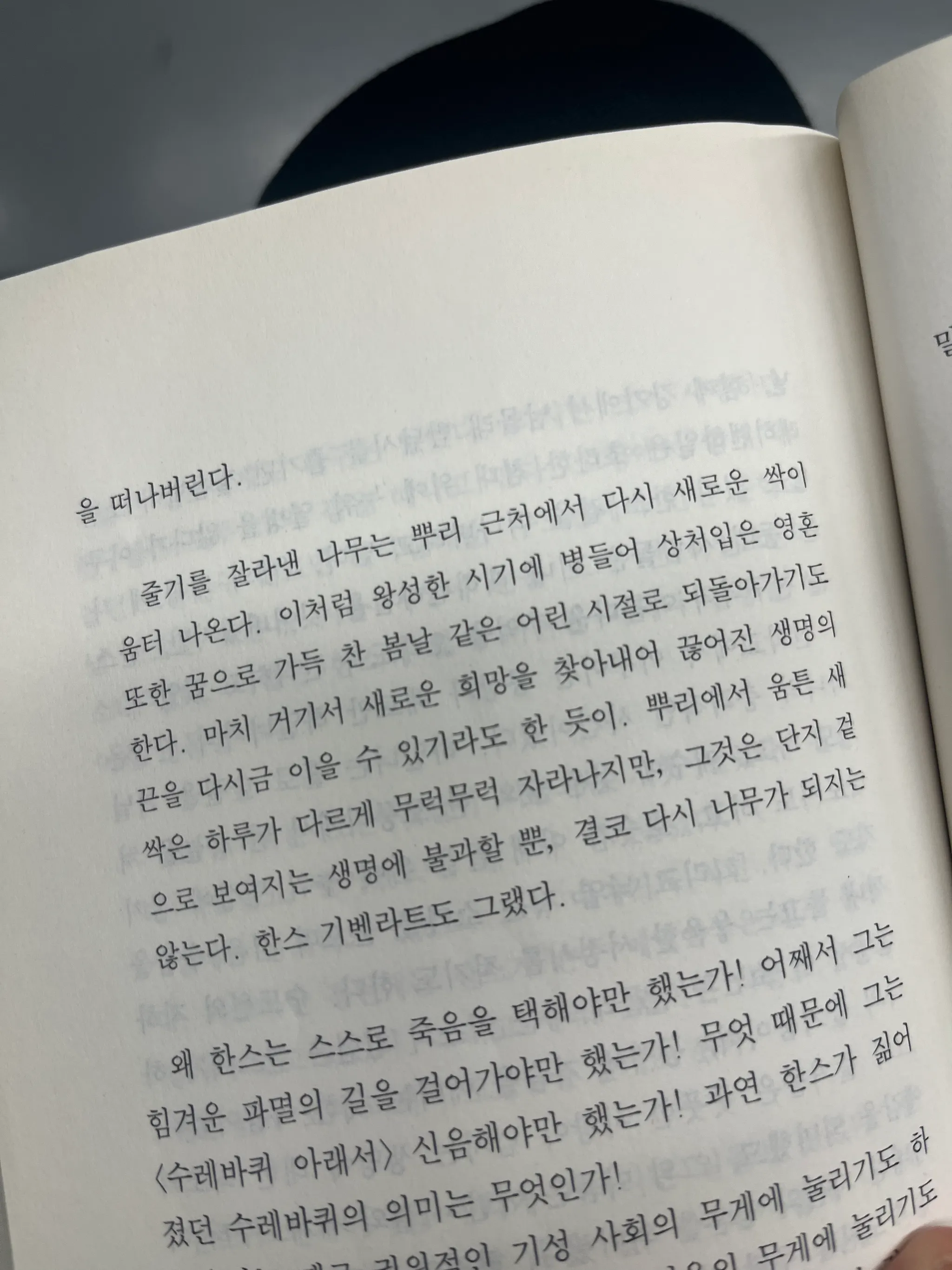 한스의 죽음을 보며, “우리 모두는 저 아이에게 소홀했다”라는 말이 나온다. 이는 작중 내내 한스에게 조언과 충고를 던진 어른들에게 던지는 말이 아닐까? 조언과 충고라는 이름이란 탈로 자신의 욕망과 바램을 투영하지 않는 사람이 되고 싶다.