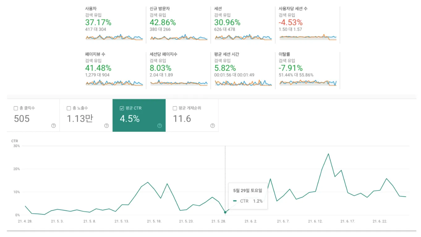 구글 서치 콘솔로 자사 홈페이지의 핵심 유입 키워드를 분석하고, 경쟁사와 자사 홈페이지의 SEO 현황을 비교 분석함으로써 SEO 최적화를 진행했습니다.