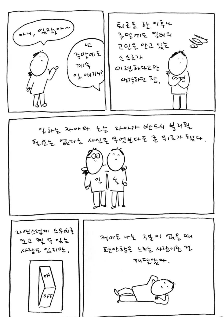 책을 읽다보니, 지금까지 “나”라는 존재의 의의를 일에서 찾으려고 했지 않았나 싶다. 그렇기에 일을 못할 때마다 스트레스를 받고, 일에 더 집착한 게 아닐까?