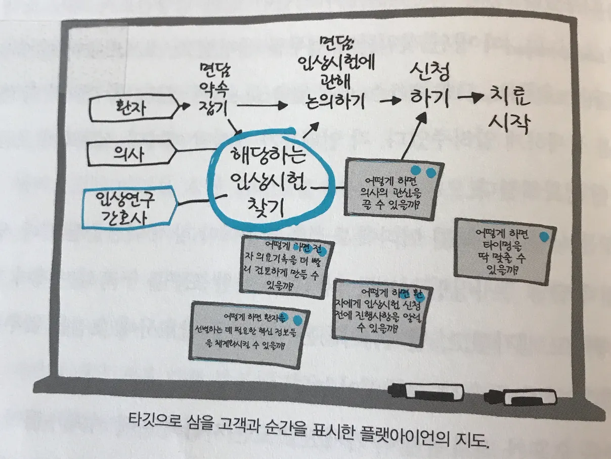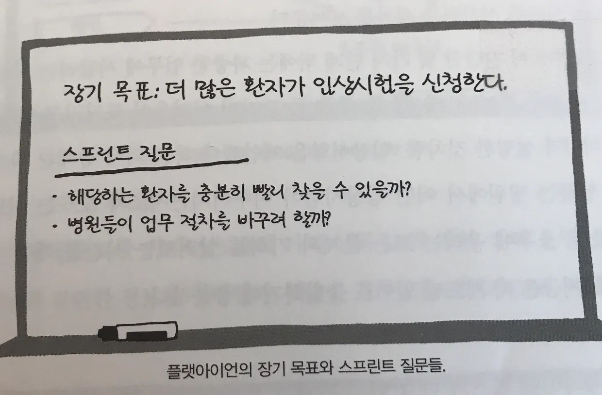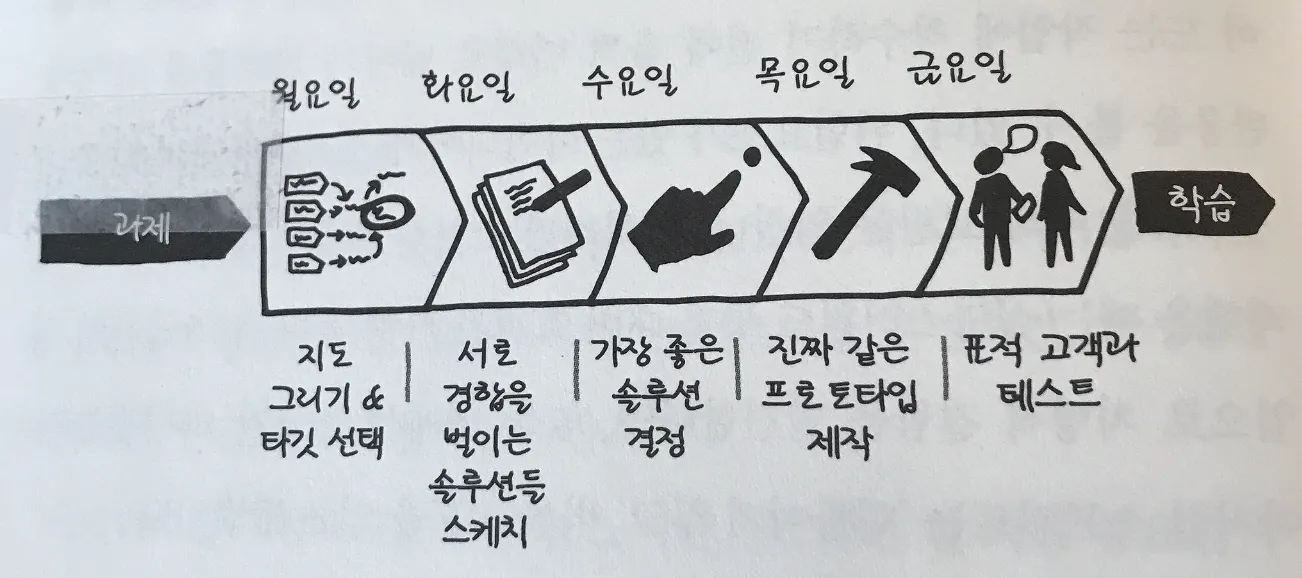 스프린트의 첫 날은 모두, 문제를 정의하는 데 쓴다. 팀의 목표를 정하고, 이 목표의 본질에 더 다가갈 수 있는 핵심 질문(=스프린트 질문)을 끊임없이 던진다. 이 후, 모든 이해관계자와 이들의 행동이 담긴 여정 지도를 그리고, 이 지도 안에서 How 질문(=무엇을 해야할까?)을 던진다. 최종적으로, 여정 지도에서 단 하나의 이해관계자와 행동을 선택한다.