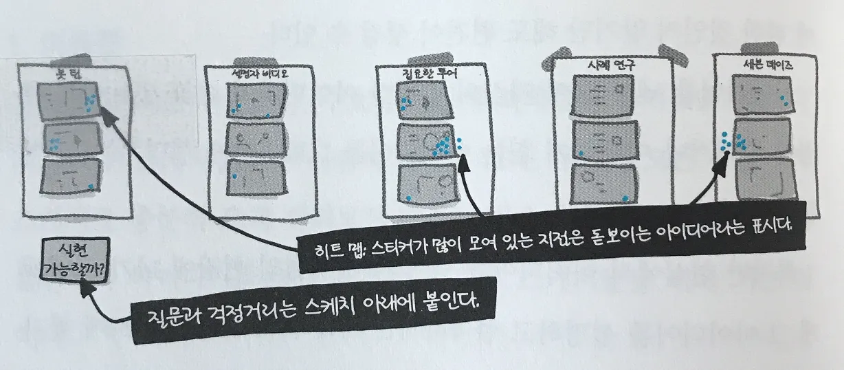 문제 정의를 통해 팀은 자신들이 문제를 풀어나갈 영역을 날카롭게 만들었다. 바로, 단 하나의 이해관계자와 행동 말이다. 이제 이걸 어떻게 풀어낼지를 정할 일만 남았다. 우리에게 친숙한 해결책 구상 방식은 집단 브레인스토밍이 있다. 하지만, 스프린트는 초기 솔루션을 팀원이 다 같이 생각하는 방식보다, 각자가 아이디어를 생각하고 서로 경쟁해서 결정하는 방식을 장려한다.