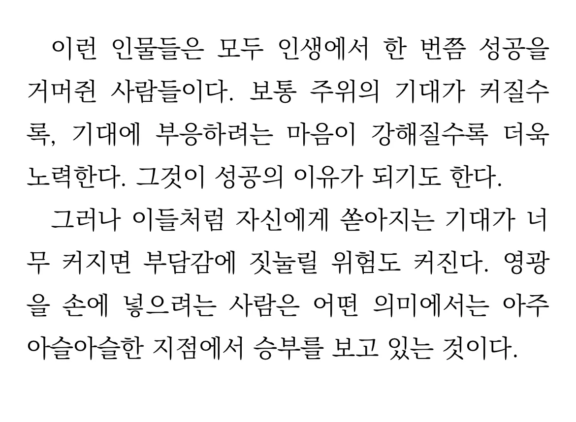 그럼에도 불구하고, 우리는 자신이 가장 빛나는 순간과 그 외의 모든 순간을 무의식 중으로 비교한다. 책에서는 정상의 자리에 올랐다가, 스스로 옭아맨 인정의 기준에 의해서 다시 추락하는 사람들이 등장한다. 인정에 있어 우리 모두는 이카루스이며, 빛남의 이면에 있는 고통이 씁쓸하기도 하다.