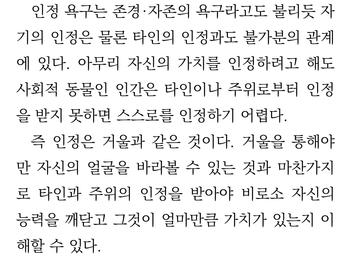 “나”의 가치는 타인이 정의한다. 제 아무리 스스로 가치가 높다고 판단해도, 타인이 동의하지 않으면 의미가 없다. 그렇기에, 인정 욕구는 자신의 존재 가치를 확인하고 싶어하는 욕망이다.