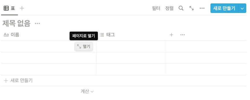 생성된 데이터베이스 각 행은 1개의 페이지 블록임을 확인할 수 있습니다. 각 행을 클릭 시, 페이지가 실행됩니다.