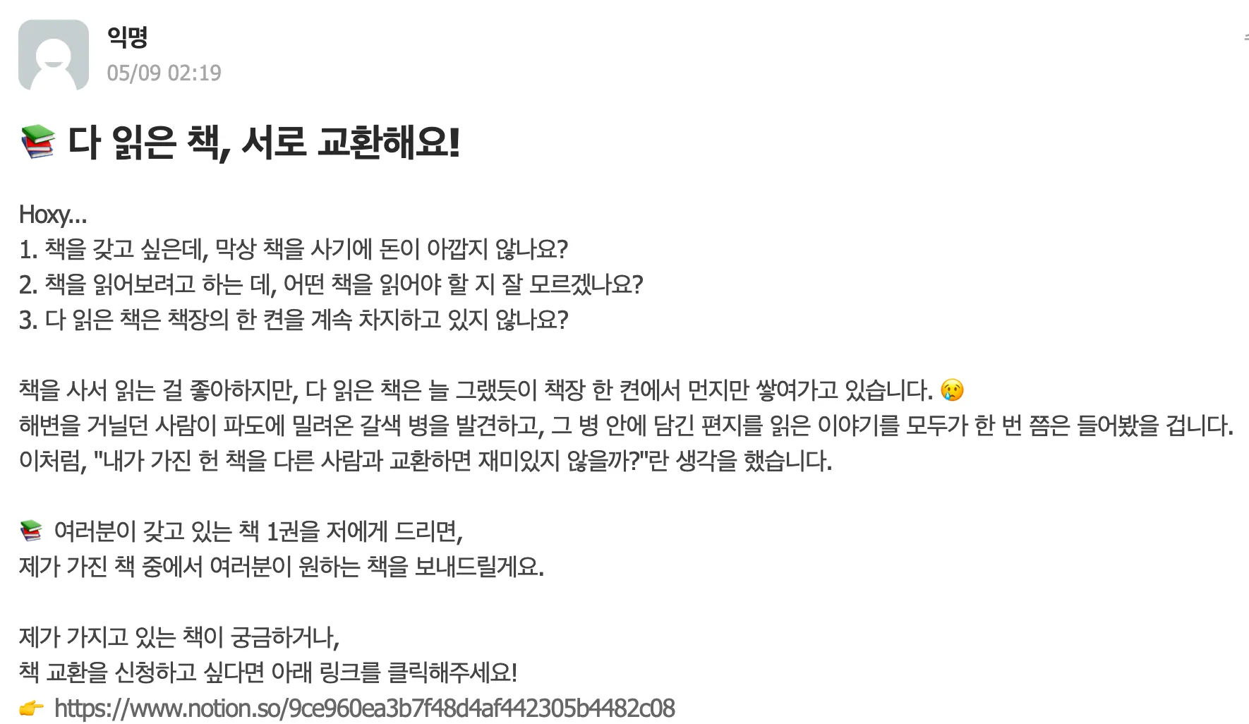 내가 가진 책을 보고 관심이 생긴다면, 교환 신청을 할 것이다.