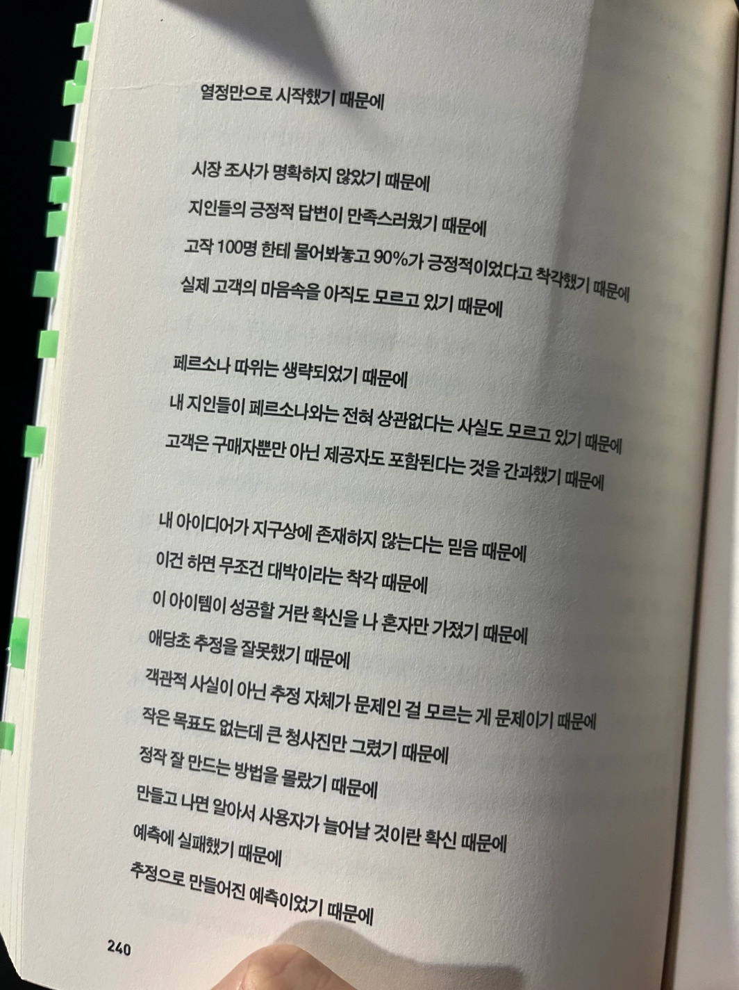 창업을 실패하는 이유는 너무도 많다. 서비스, BM, 고객, 방법론 등 여러 영역에서 무수히 많은 오답이 독립적으로 존재하고, 모든 문제를 슬기롭게 풀어내야지 창업에 성공할 수 있다. 하지만, 나의 현재 경험과 지식만으로 모든 문제의 정답을 알지 못하며, 나도 모르는 사이에 오답을 선택할 수 있다. 그리고, 이전에는 눈에 보이지 않던 상황이 한 순간에 나를 집어닥칠 때, 오답을 선택했음을 깨닫게 된다. 문제 풀이 결과는 사전에 오지 않고, 한순간에 등장한다.