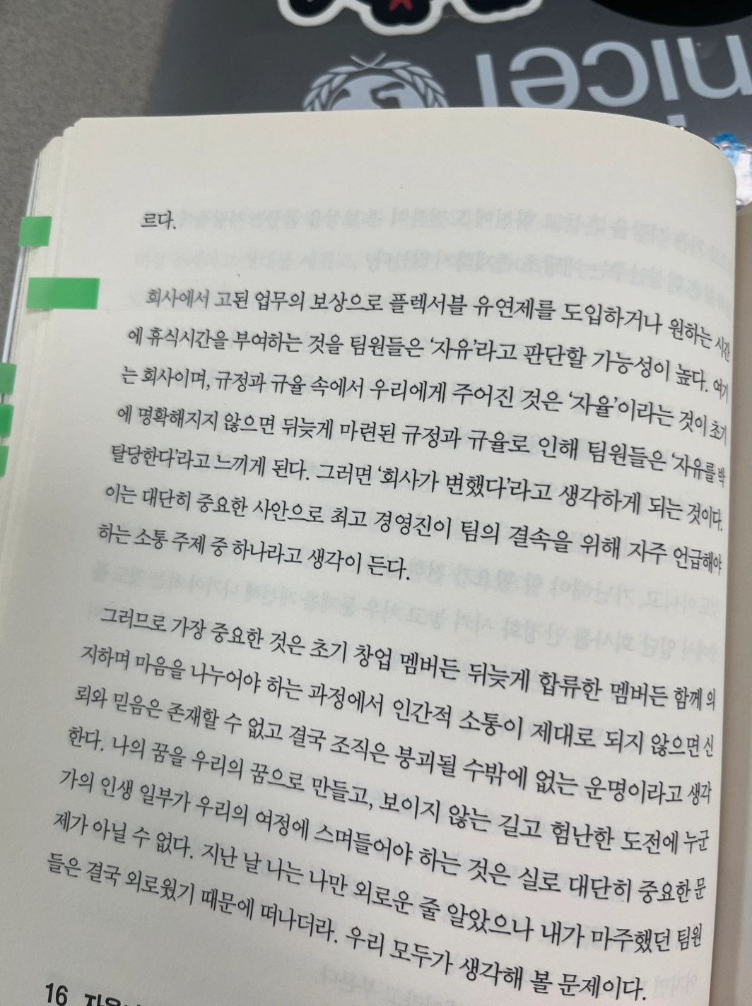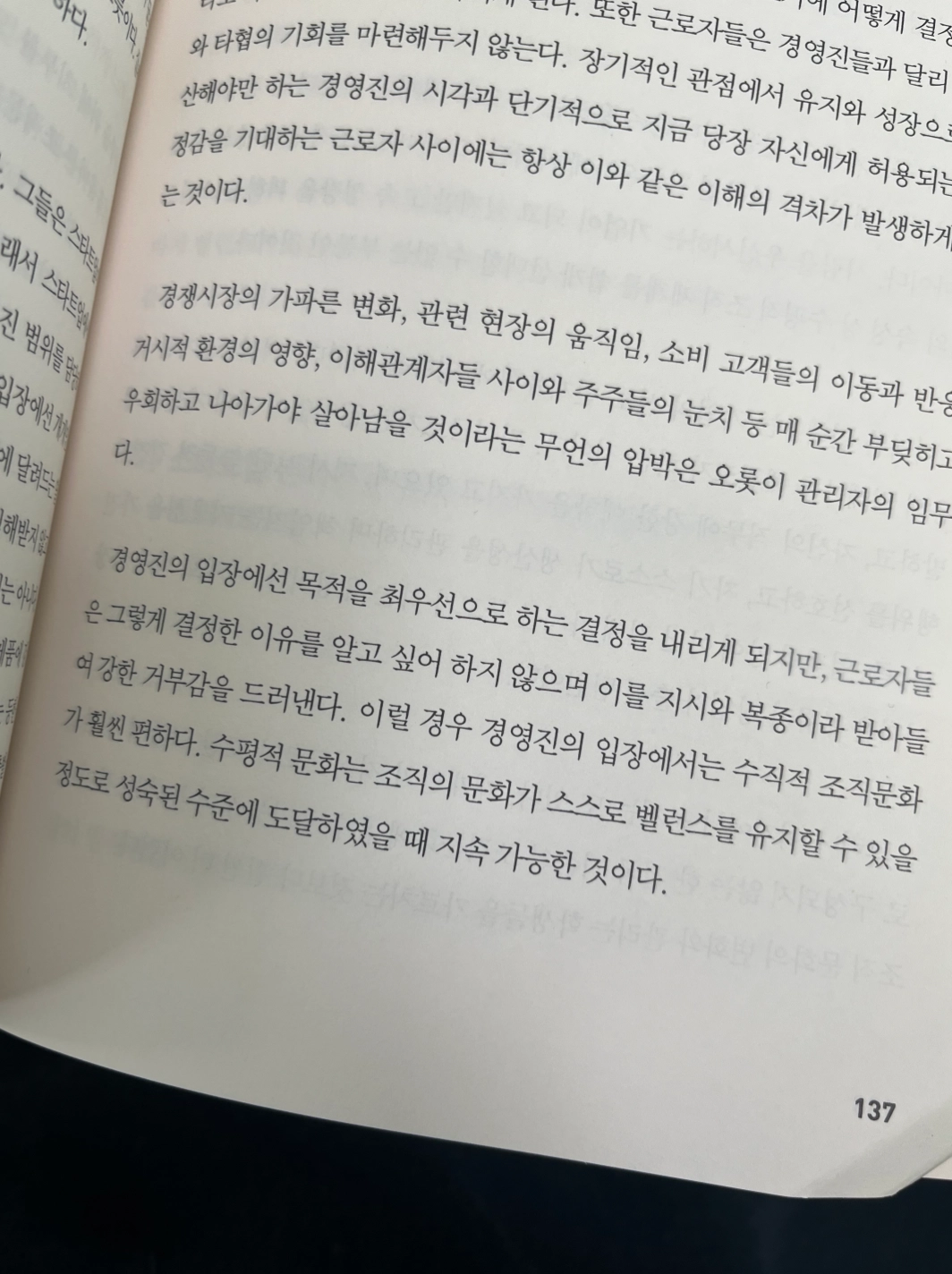 “수평적 문화는 조직의 문화가 스스로 밸런스를 유지할 수 있을 정도로 성숙된 수준에 도달하였을 때 지속 가능한 것이다.” 되게 와 닿는 표현이다.