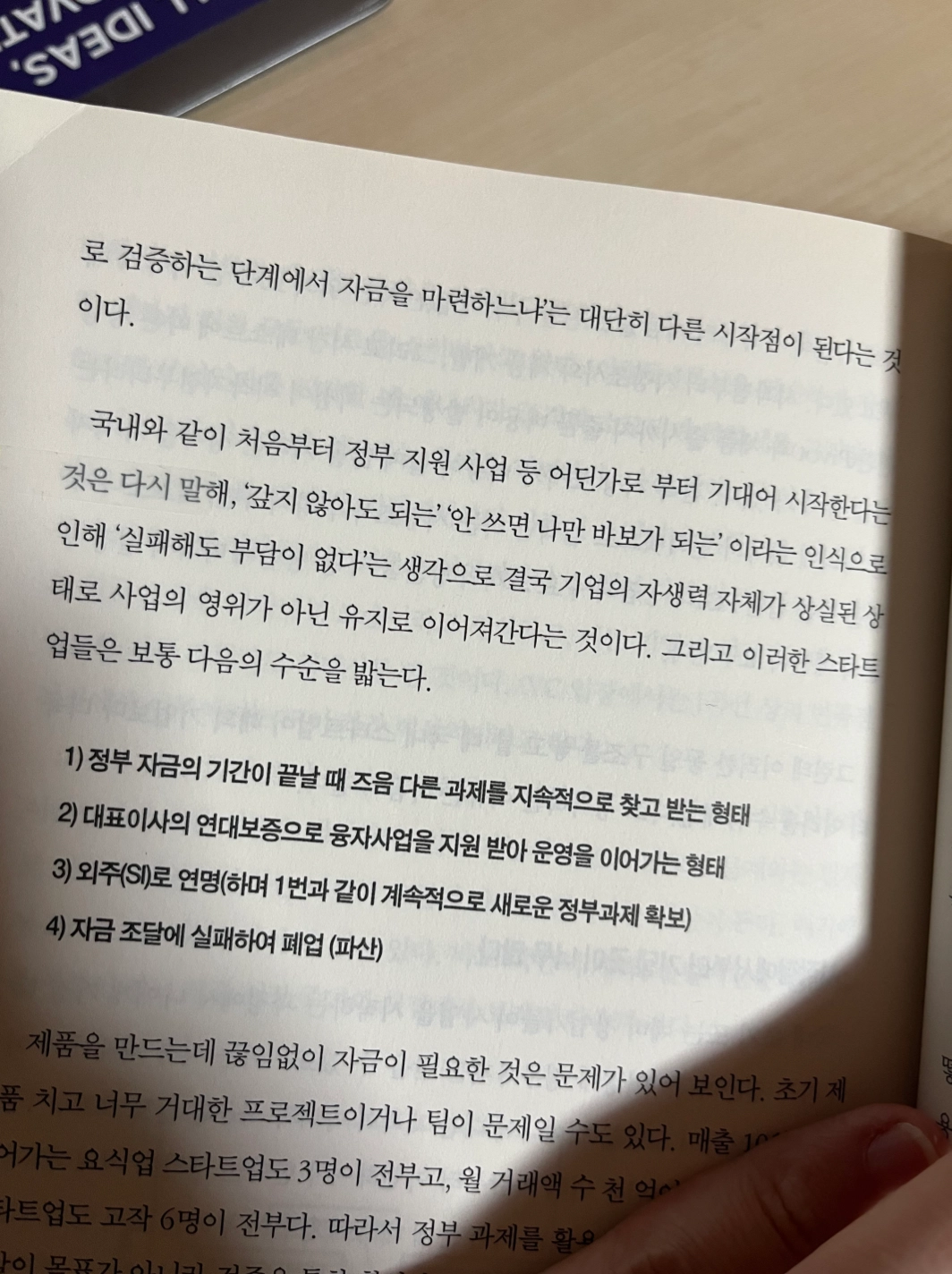 투자를 받아서 성장하는 것보다, 자생적 환경을 먼저 구축하는 게 스타트업의 생존에 더 유리하다. 투자는 미래의 비예측적인 결과를 기대하며 버티는 수단으로 선택되지만, 이 결과에 도달하기까지 얼만큼의 시간이 걸릴지 예측 불가다. 그 과정에서 기업이 망할 수도 있다. 반면, 자립적 환경을 먼저 구축해둔다면, 미래의 결과에 도달하기까지 시간은 더 느릴지언정, 그 과정을 견딜 수가 있다. 이를 반증하는 게 작년도부터 이어진 수 많은 스타트업의 파산과 구조 조정이다.