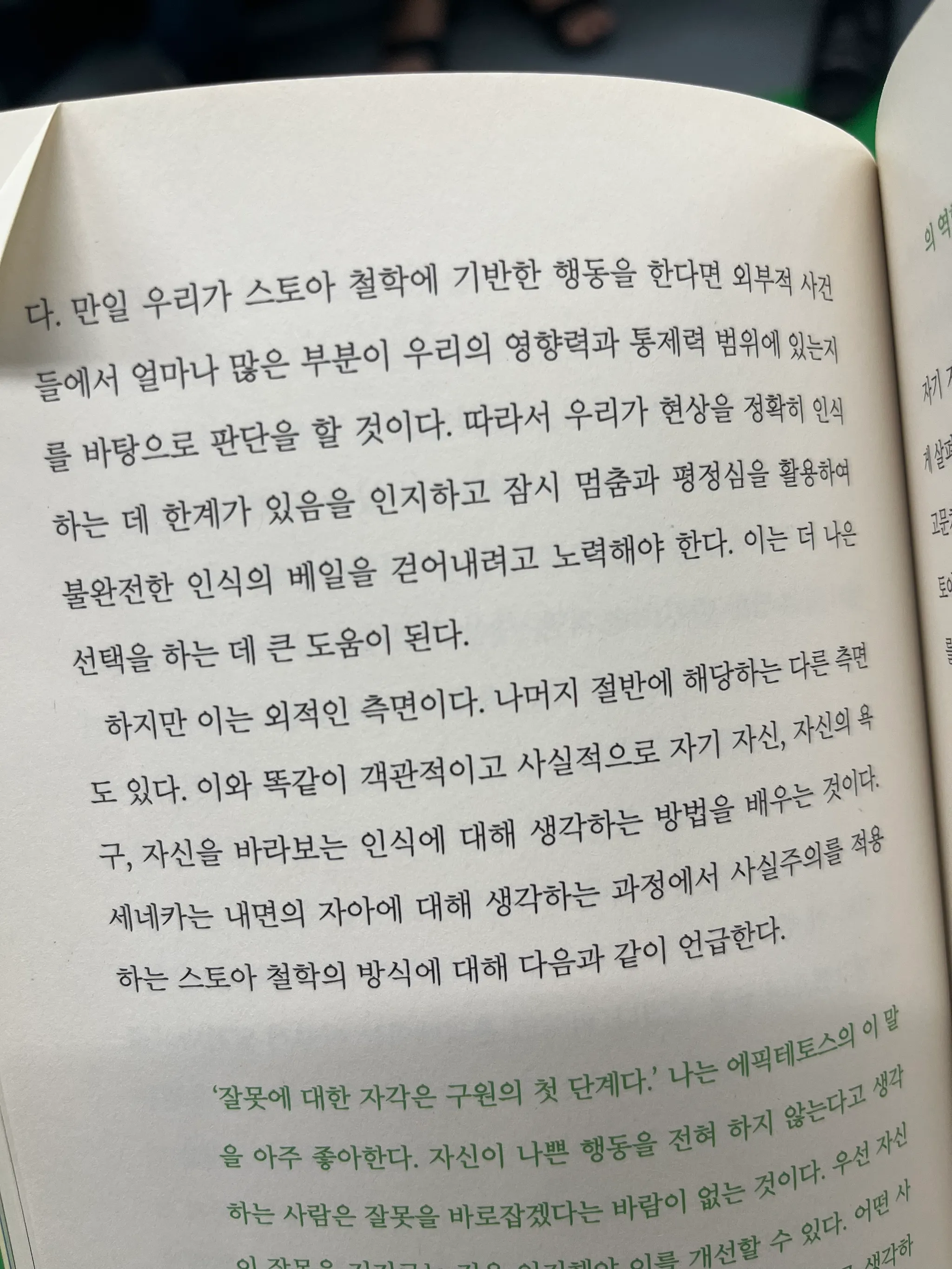 스토아 철학이 말하는 통제 불가능한 존재에 대해 매몰되지 말 것, 여기에는 대상을 사실, 그대로 바라보지 못하는 자신의 인식도 포함되는 듯 하다. 오히려 내 주관적 인식에 매몰되다 보니, 대상을 향한 확증 편향이 더 강해지는 느낌이다. 통제 불가능한 대상에 대해 거리를 두고 생각하기, 이게 지금 나에게 가장 필요한 능력이 아닐까?