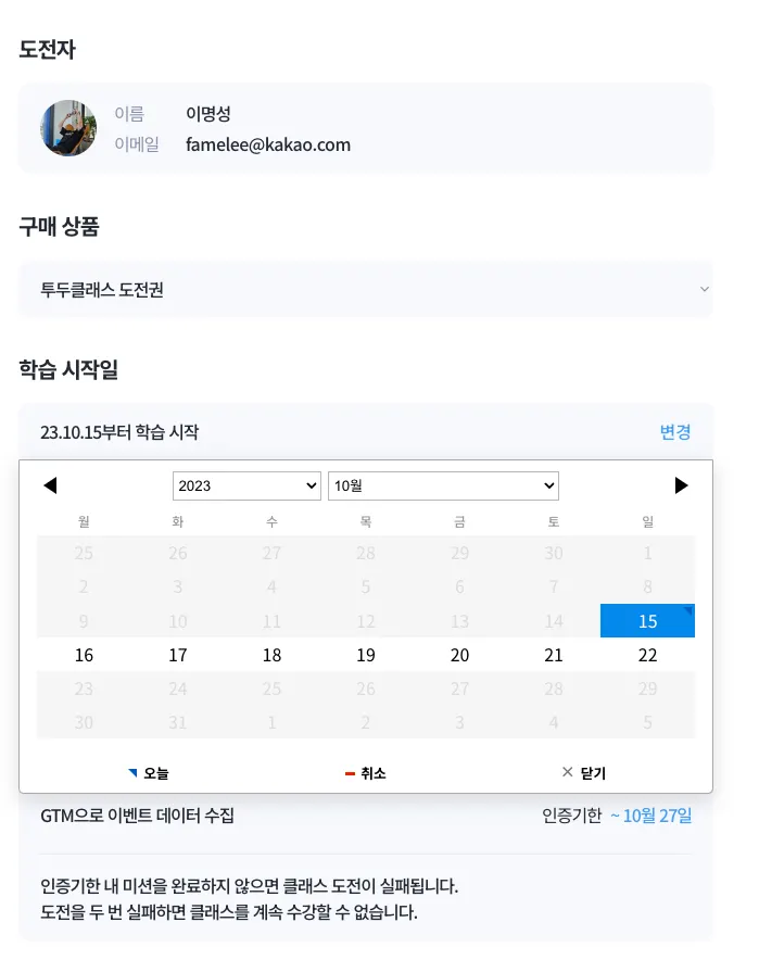 클래스 구매 로직에 학습 시작일을 선택하는 스텝을 추가했습니다.
