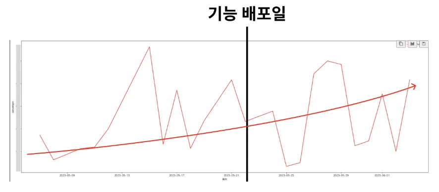 기능 배포일 전후로 일별 구매 전환율이 점점 우상향을 그리는 걸 확인했습니다.
