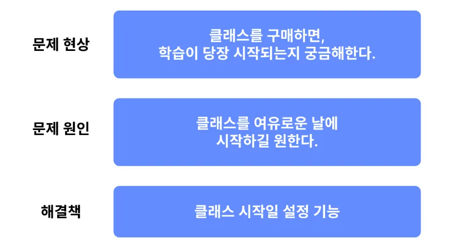 유저 관점에서 문의에 대해 다시 접근해봤습니다. "학습이 지금 시작되냐고 물어봤을 당시에 유저는 어떠한 상황에 있을까?"라는 질문을 던져보니, 문의 속에 담긴 의미를 파악할 수 있었습니다. 유저가 남긴 문의는 "클래스를 구매했을 때, 학습이 당장 시작되나요?"가 아니라, "클래스를 지금이 아닌, 나중에 시작할 수 없나요?"였습니다.
