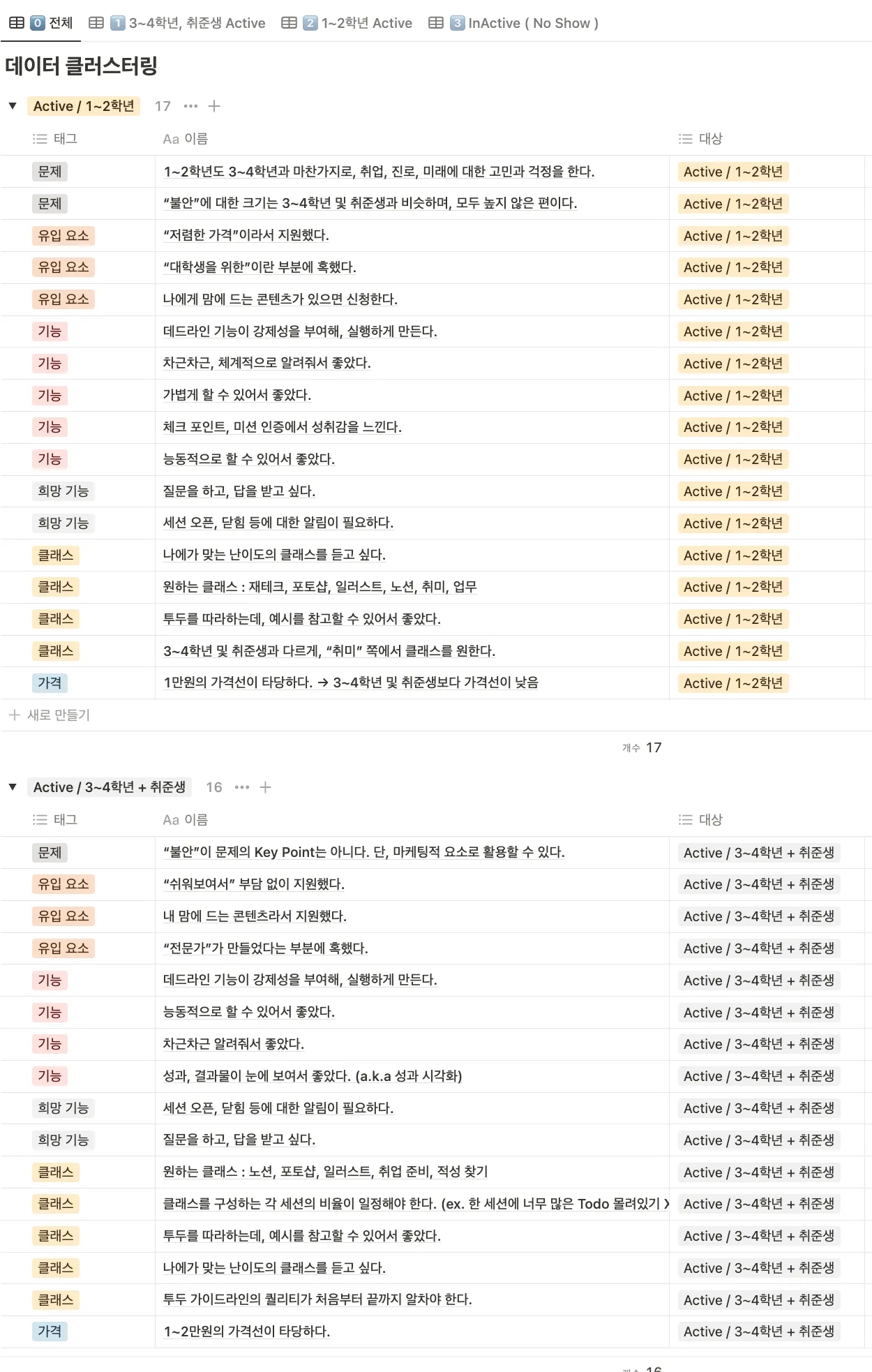 인터뷰를 통해 수집한 정성 데이터를 포스트잇에 모두 적고, 클러스터링해서 인사이트를 도출했습니다.