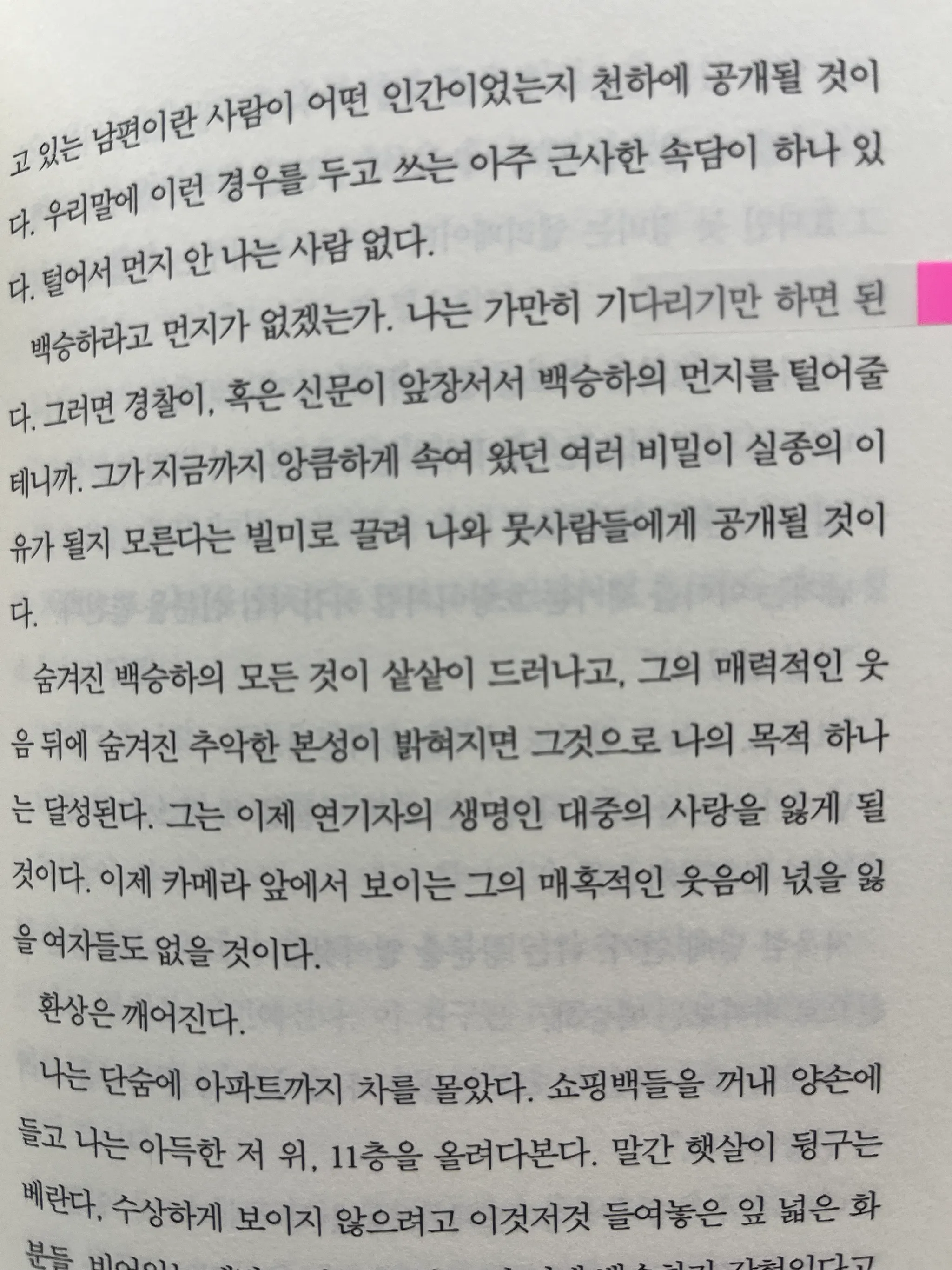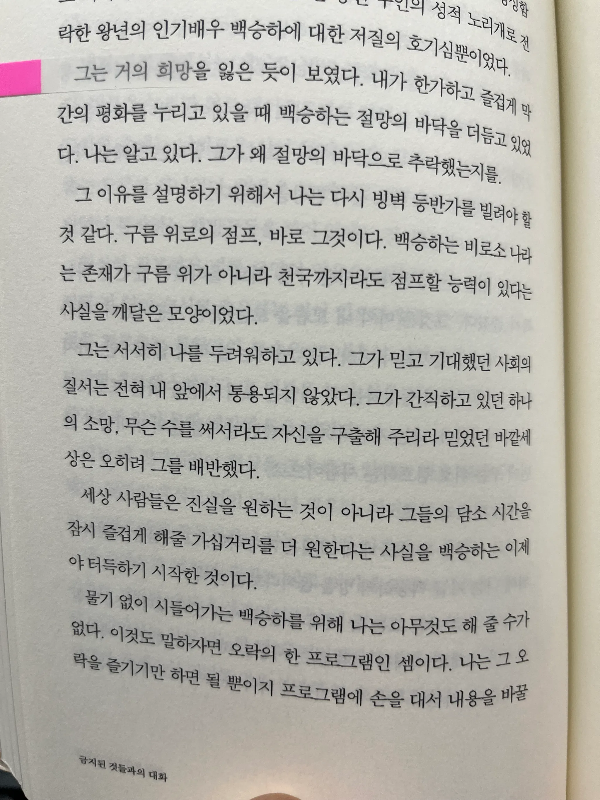 내가 한가하고 즐겁게 막간의 평화를 누리고 있을 때 백승하는 절망의 바닥을 더듬고 있었 다. 나는 알고 있다. 그가 왜 절망의 바닥으로 추락했는지를.