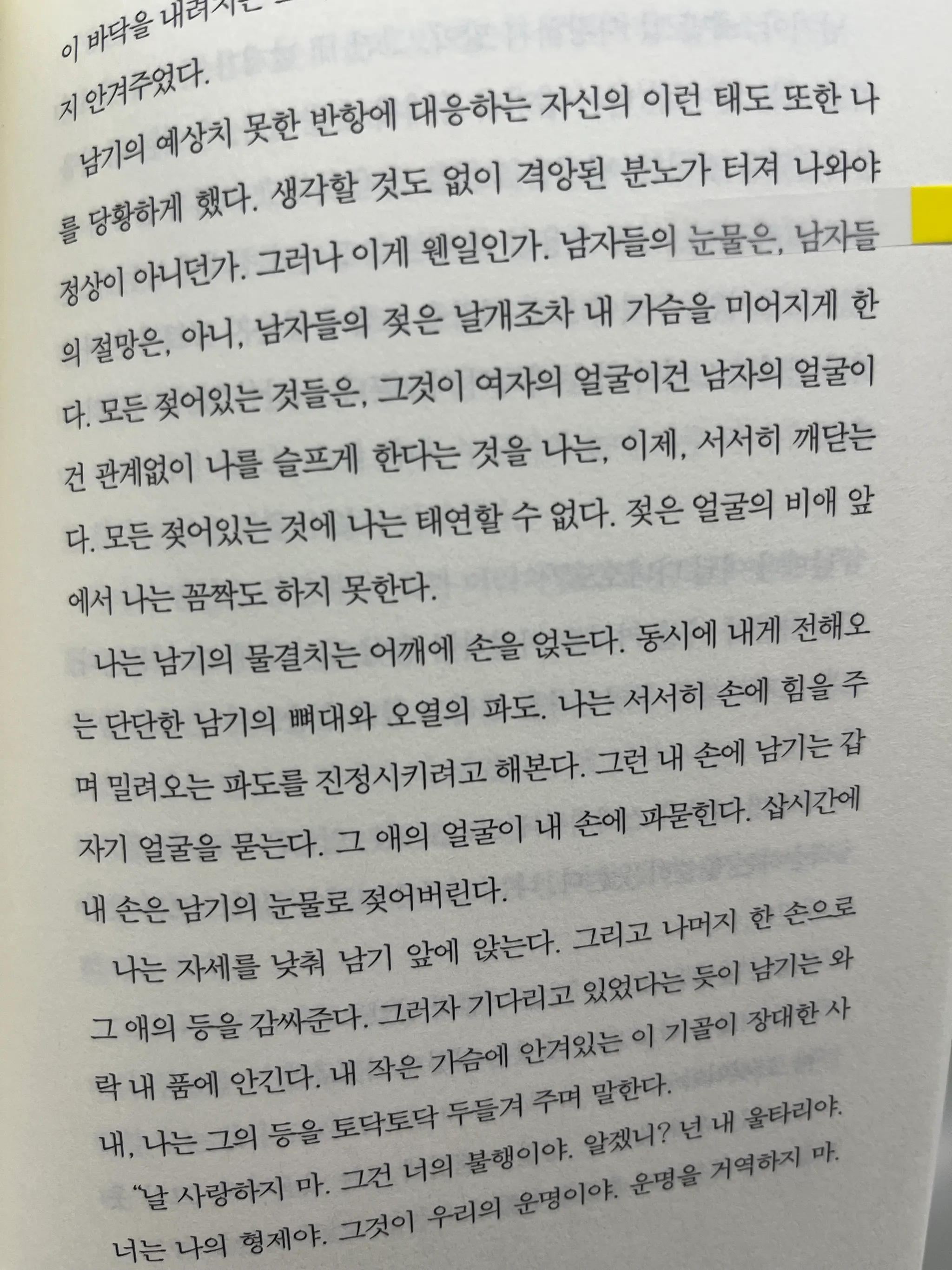 그러나 이게 웬일인가. 남자들의 눈물은, 남자들의 절망은, 아니, 남자들의 젖은 날개조차 내 가슴을 미어지게 한다. 모든 젖어있는 것들은, 그것이 여자의 얼굴이건 남자의 얼굴이 건 관계없이 나를 슬프게 한다는 것을 나는, 이제, 서서히 깨닫는다. 모든 젖어있는 것에 나는 태연할 수 없다. 젖은 얼굴의 비애 앞 에서 나는 꼼짝도 하지 못한다.