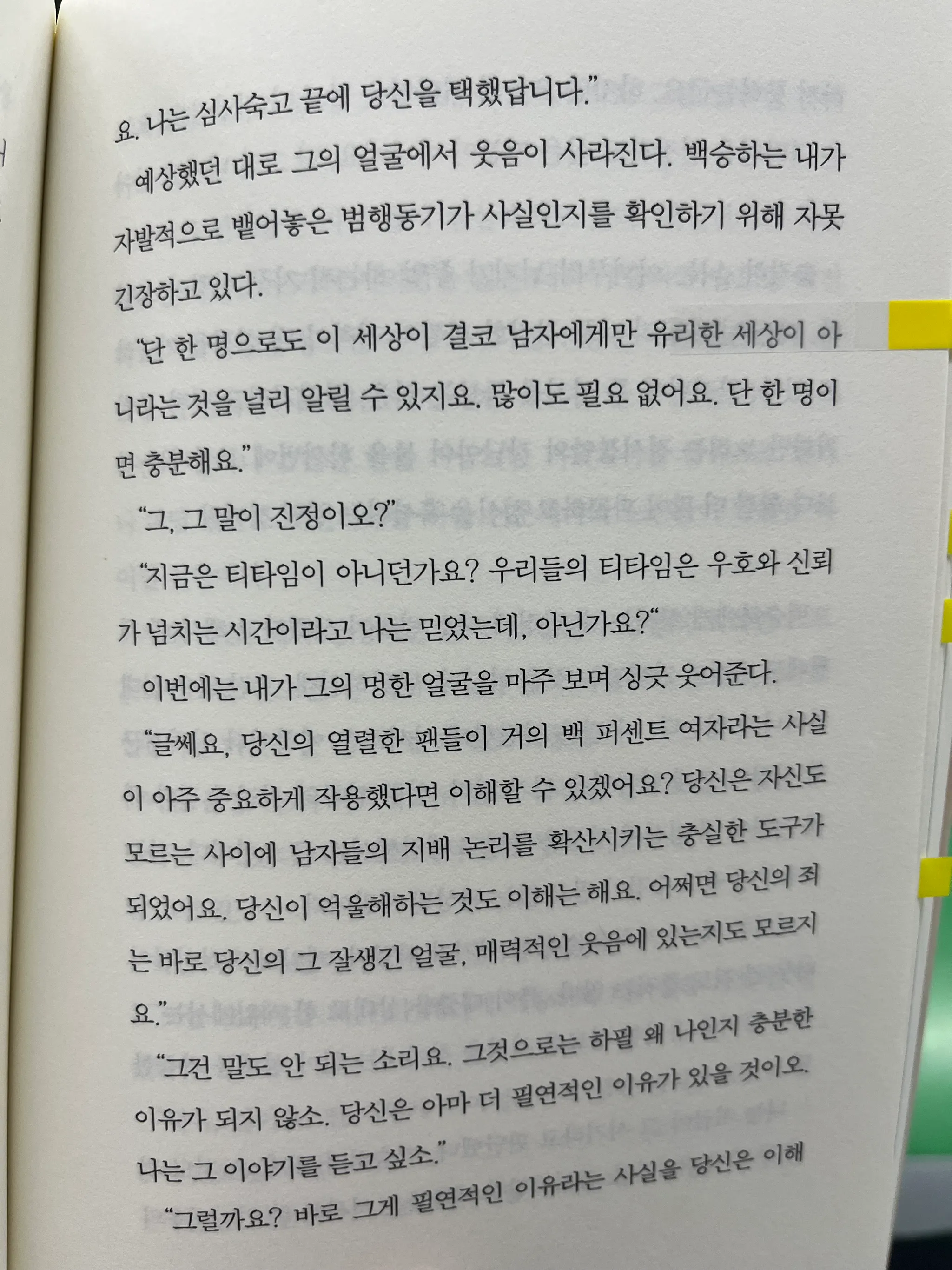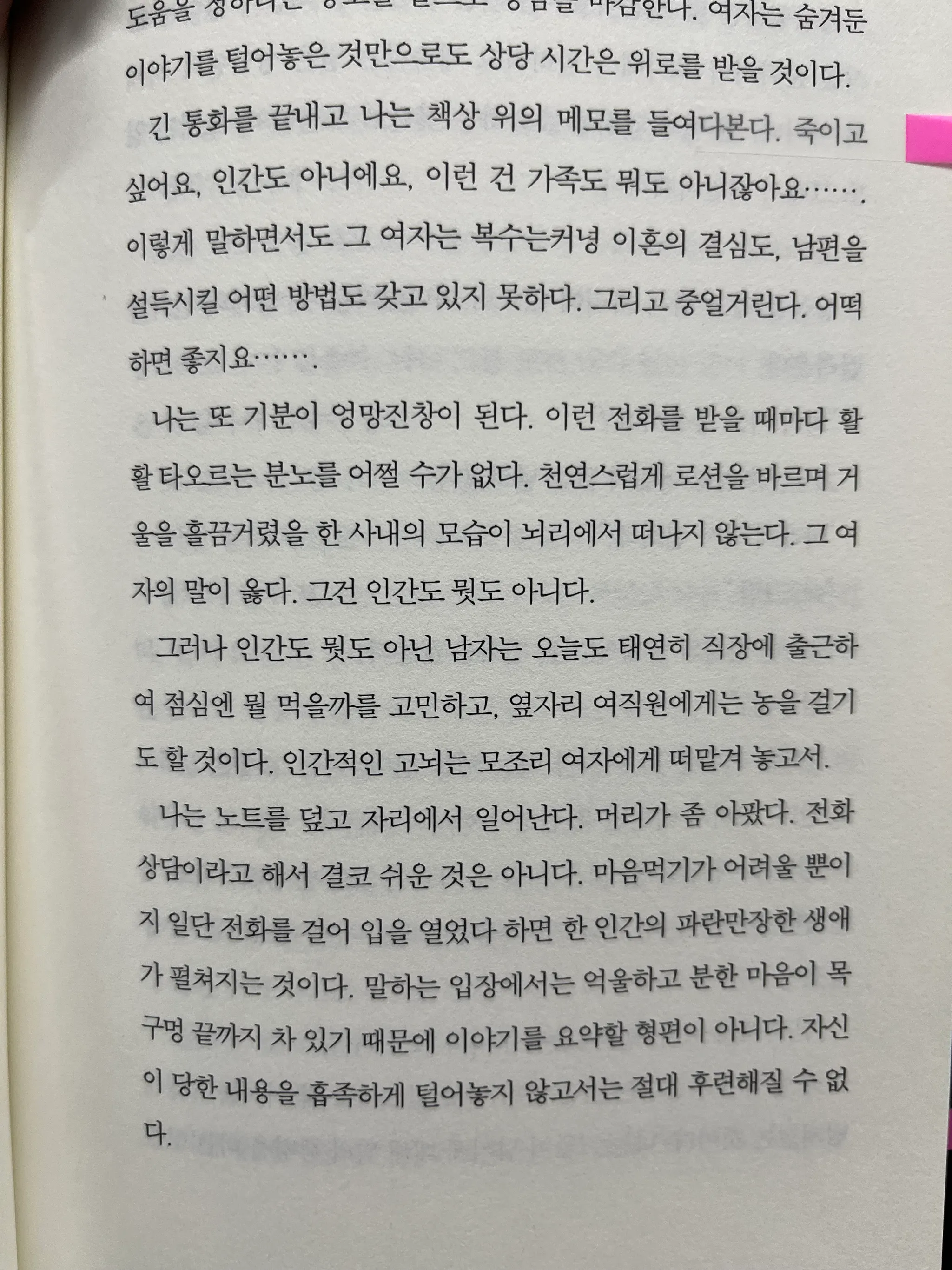 사실 그녀는 불행한 이야기에 분노하는 자신의 모습에, 타인의 감정에 공감하는 모습을 엿보는 게 아닐까? 설령 분노에 기반한 공감일지라도, 이러한 감정으로 타인과 연결되고 싶음을 내심 바래는 게 아닐까? 책의 제목은 <나는 소망한다 내게 금지된 것을>이다. 여기서 금지된 것은 타인과의 유대감은 아닐까 짐작해본더.