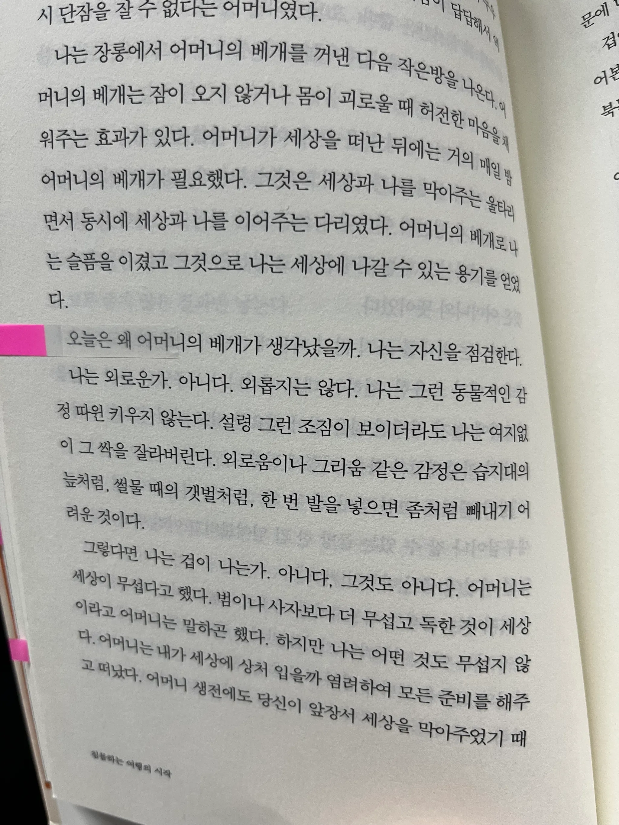 어머니가 세상을 떠난 뒤에는 거의 매일 밤 어머니의 배개가 필요했다. 그것은 세상과 나를 막아주면서 동시에 세상과 나를 이어주는 다리었다. 어머니의 배개로 나는 슬픔을 이겼고 그것으로 나는 세상에 나갈 수 있는 용기를 얻었다.