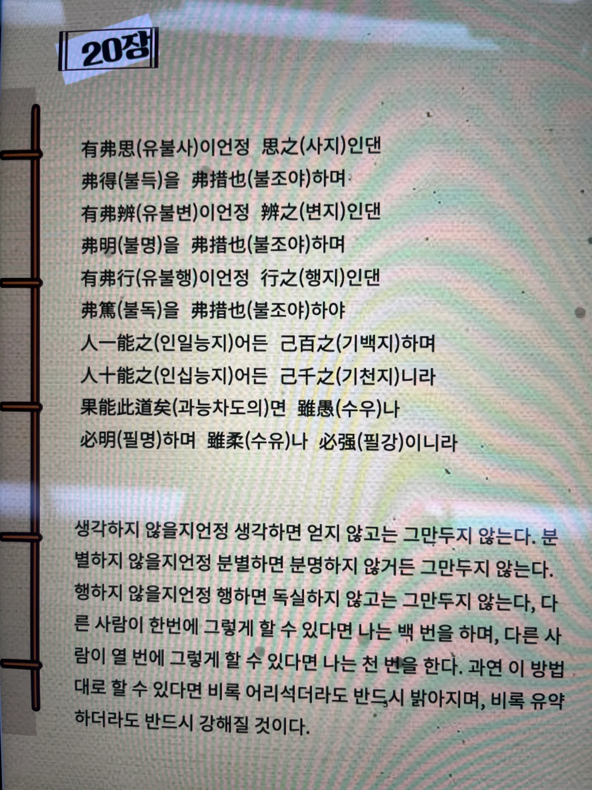 생각하지 않을지언정, 생각하면 얻지 않고는 그만두지 않는다. 분별하지 않을지언정, 분별하면 분명하지 않거든 그만두지 않는다. 행하지 않을지언정, 행하면 독실하지 않고는 그만두지 않는다.